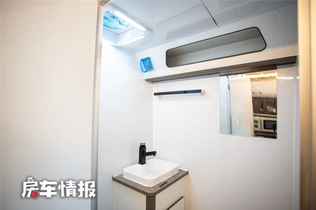 接下来是卫生间,可以容纳两名成年人,虽然空间很大,但是缺点就是没有配备马桶和淋浴花洒,卫生间里只有一个洗手池和镜子,后期还需要自行加装。不过在这个空间里加装还是很方便的。