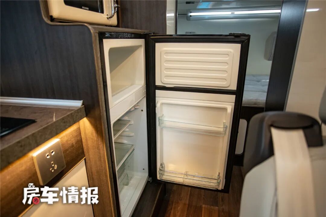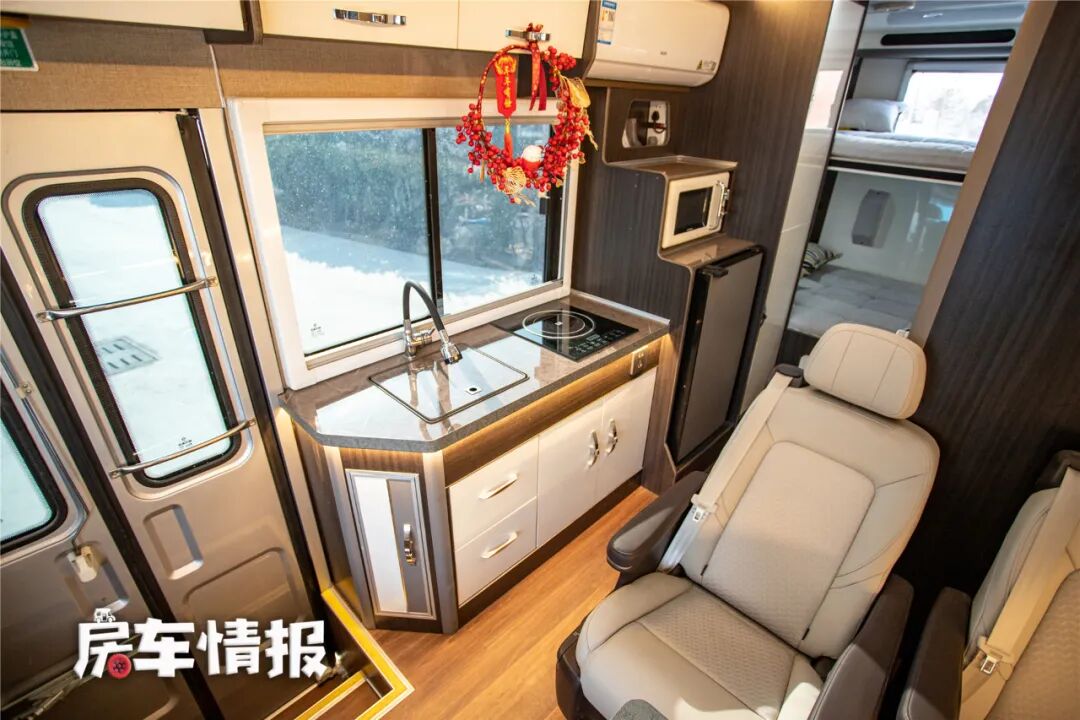 厨房区域位于车门旁,面积也很大,装有洗菜池、电磁炉、微波炉、冰箱、储物柜,可以在这里尽情施展厨艺,为家人朋友带来丰盛的菜肴。