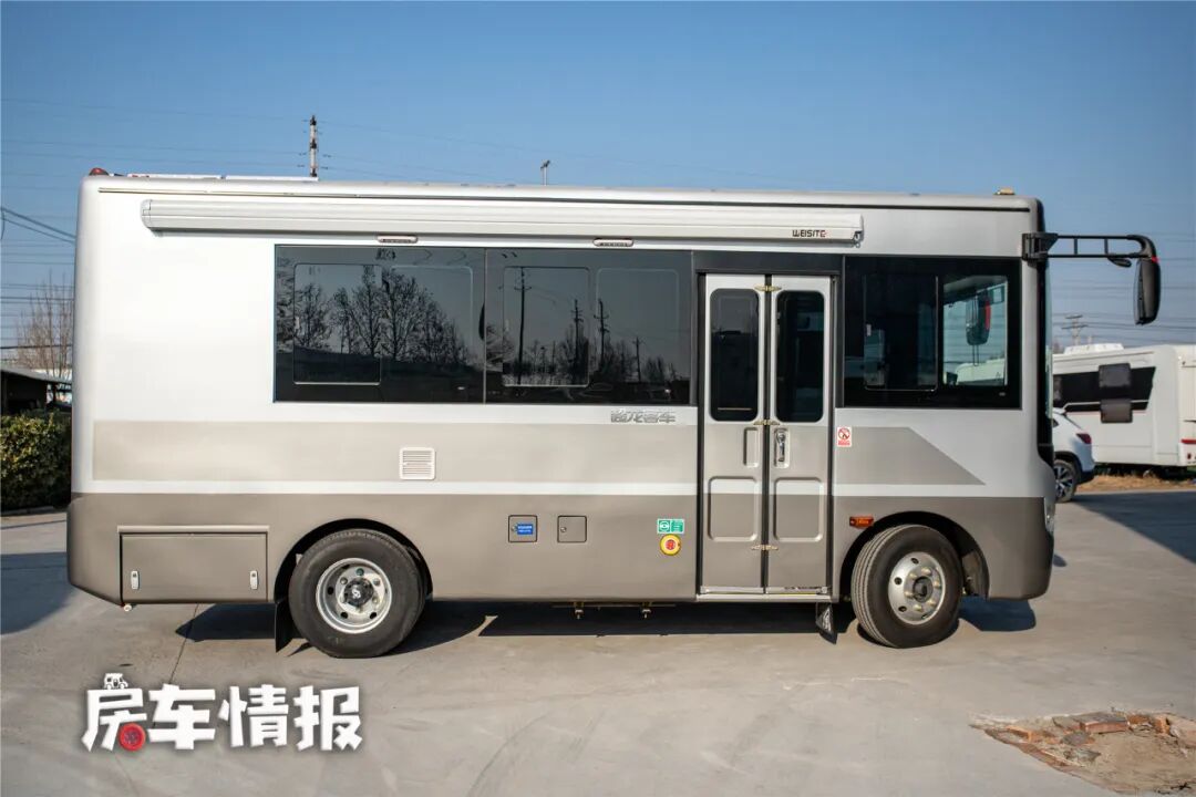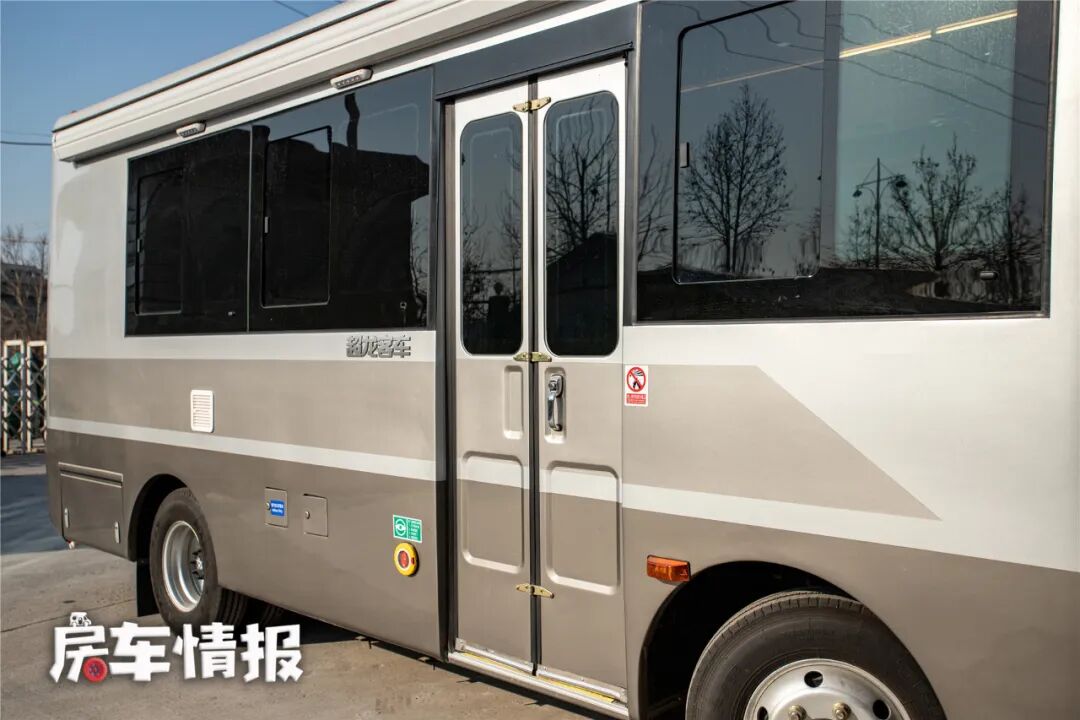 想要进入生活区,可以从右侧的车门进去,这个车门大家一定很熟悉,因为它和部分公交车是一样的,而且这个车门是气动开关的,需要从驾驶位打开关闭,有些麻烦,当然也可以手动开关,但是无论使用哪种方式,在房车中使用这样的车门还是有些麻烦的。