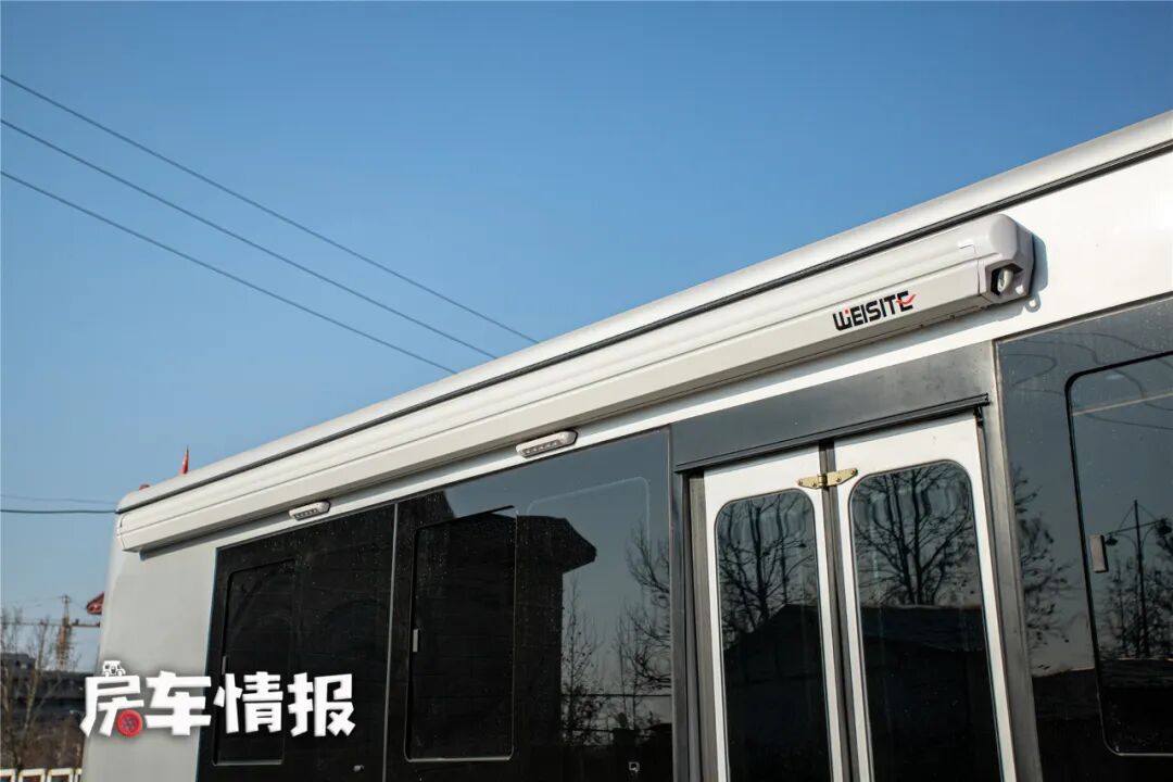 车身右侧安装了一个手动遮阳棚,这样在车外休息也不用担心被太阳晒到了,还可以就餐,与大自然更加亲近。同侧还有水电接口,方便大家出行使用。