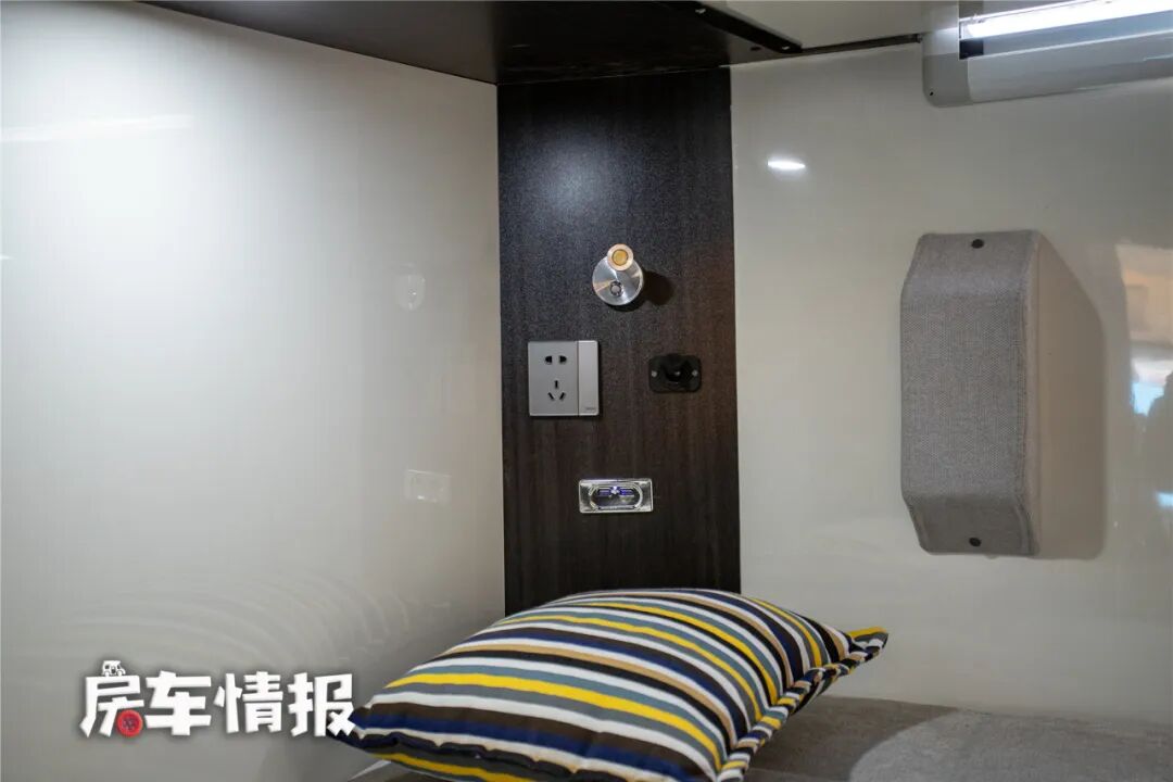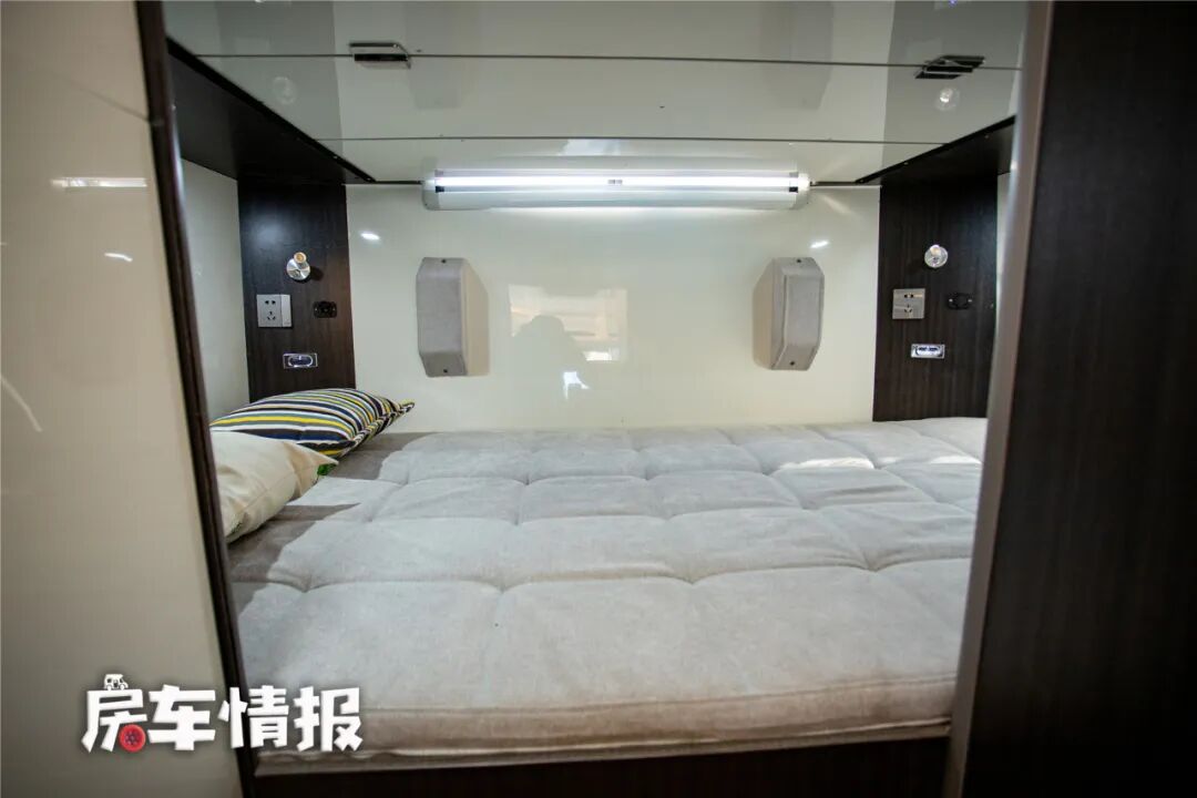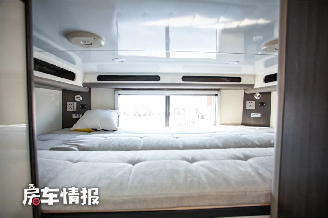 最后便是本车的超大上下层双人床,尺寸达到了2180*1400mm,轻松睡下4名成年人,两名大人带着两个孩子出行更是不在话下,在这里可以舒舒服服地睡个好觉了。车尾的窗户和床头的阅读灯让大家不会缺少光亮,还配有充电接口,可以随时使用电子产品。