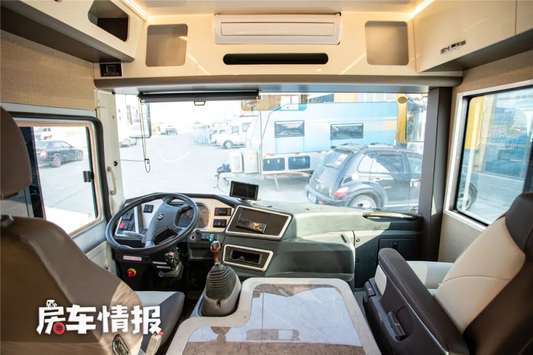 驾驶室内是原车的样子,而且还和生活区融合到了一起,过去虽然有点麻烦,但还是可以通过的。相比其它房车,这辆车扁平的车头让驾驶员的视线更好。本车的刹车装置使用的是更为安全可靠的气刹,让行驶更加安全。不过主驾驶的座椅不是很舒服,长时间的驾驶感应该不会很好。为了全车对房车的打造,驾驶室前方和两侧也装上了和生活区同风格的置物格,可以放置物品,