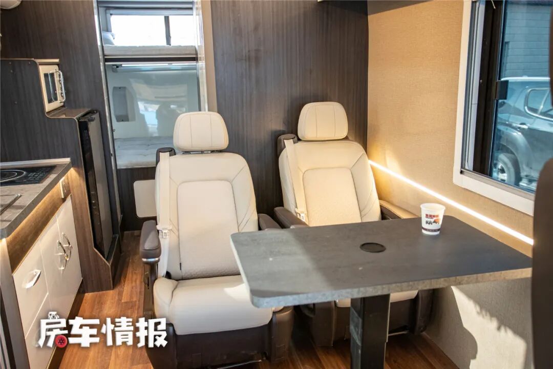 首先是会客区,由一张可升降餐桌和两个单独的车辆座椅,材料摸上去很舒服,填充也很柔软,坐上去十分的舒服,再加上这么大的空间,属实是一种享受。每个座椅都配有安全带,行车时也可以乘坐。