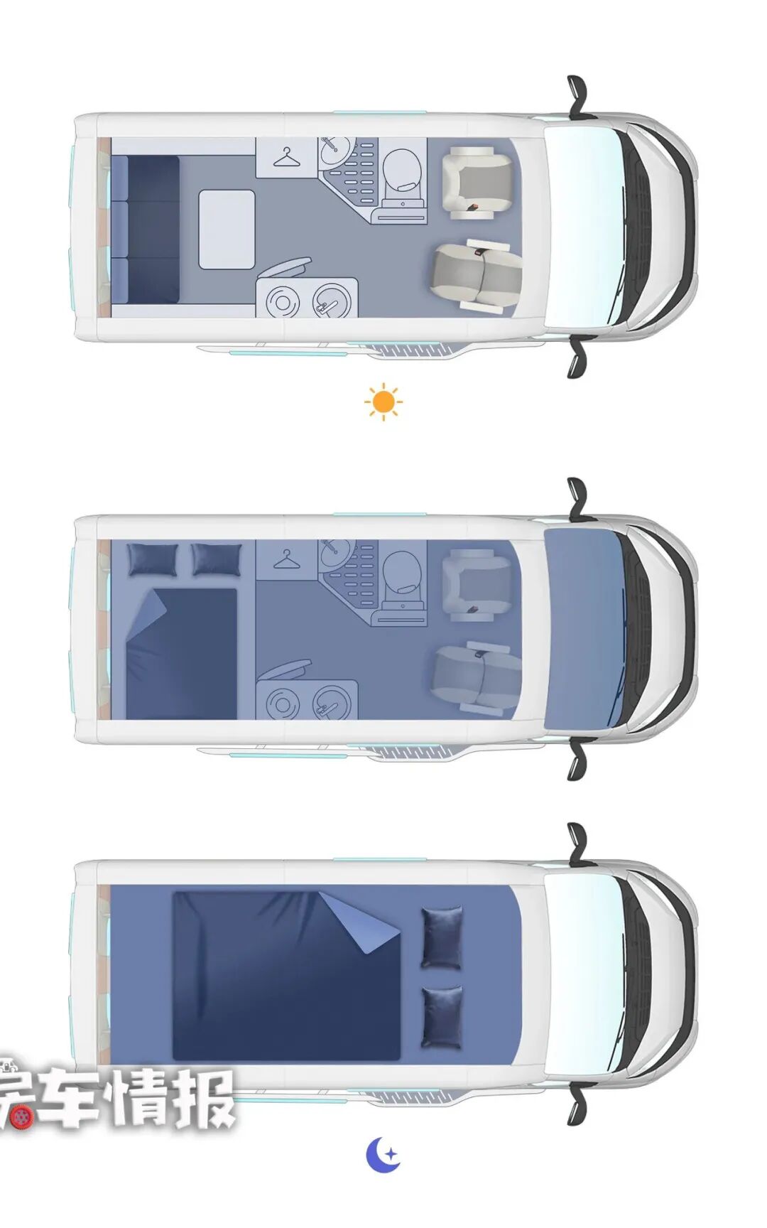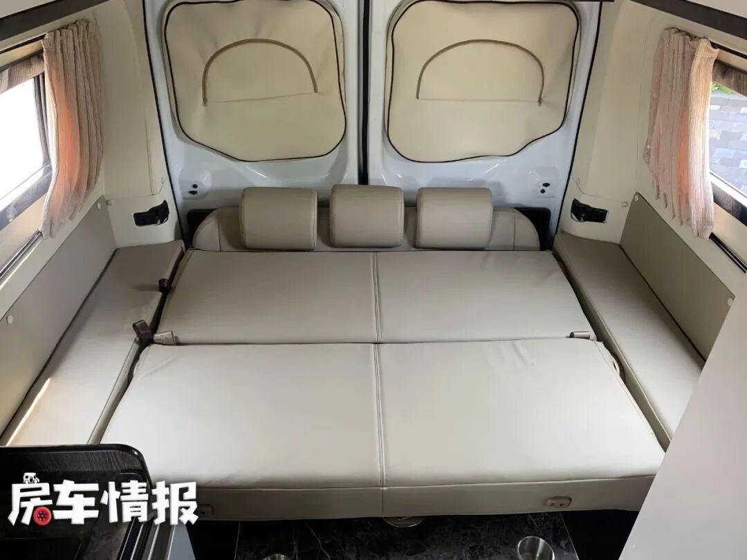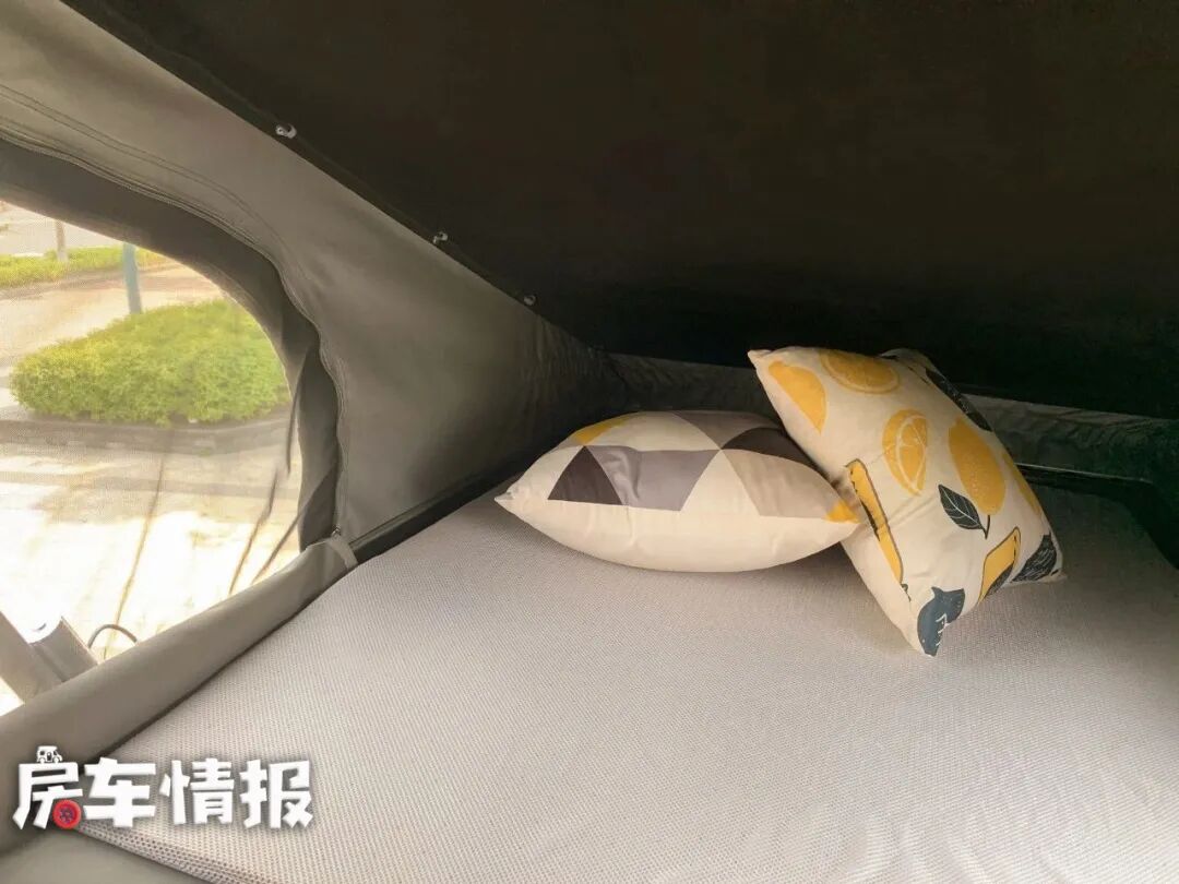 当车内有2名以上的朋友需要休息时,可以打开电动升顶,这样就又多了一张2100×1200mm的双人床,两侧还有纱窗,可以为车内增加亮度,避免压抑。