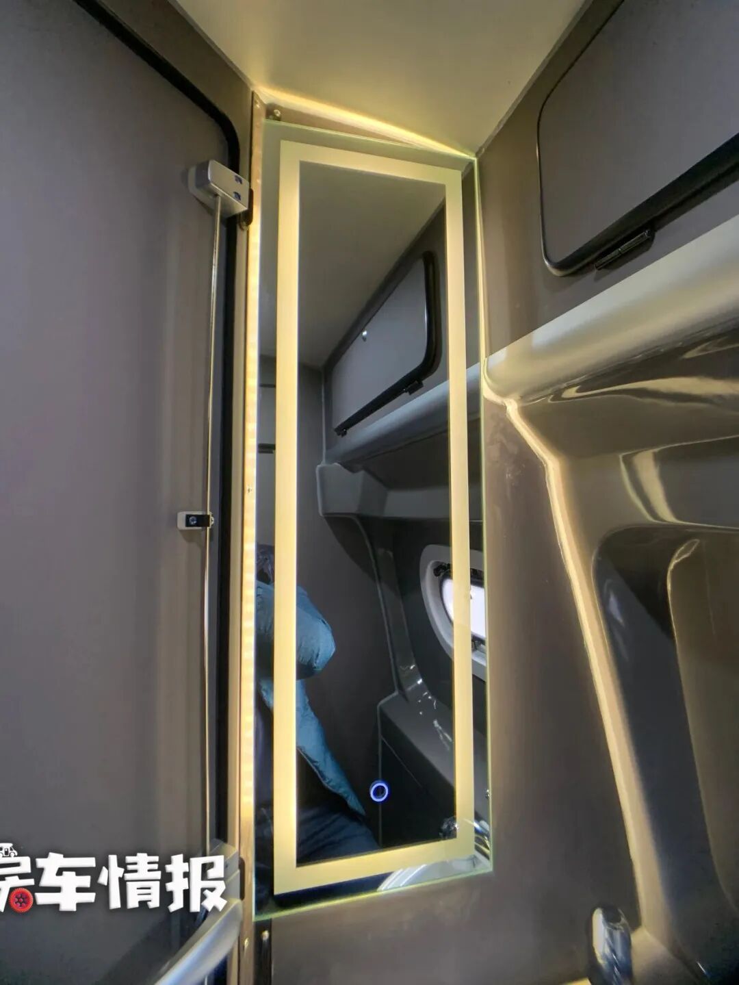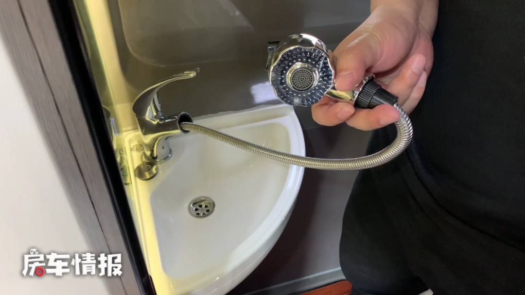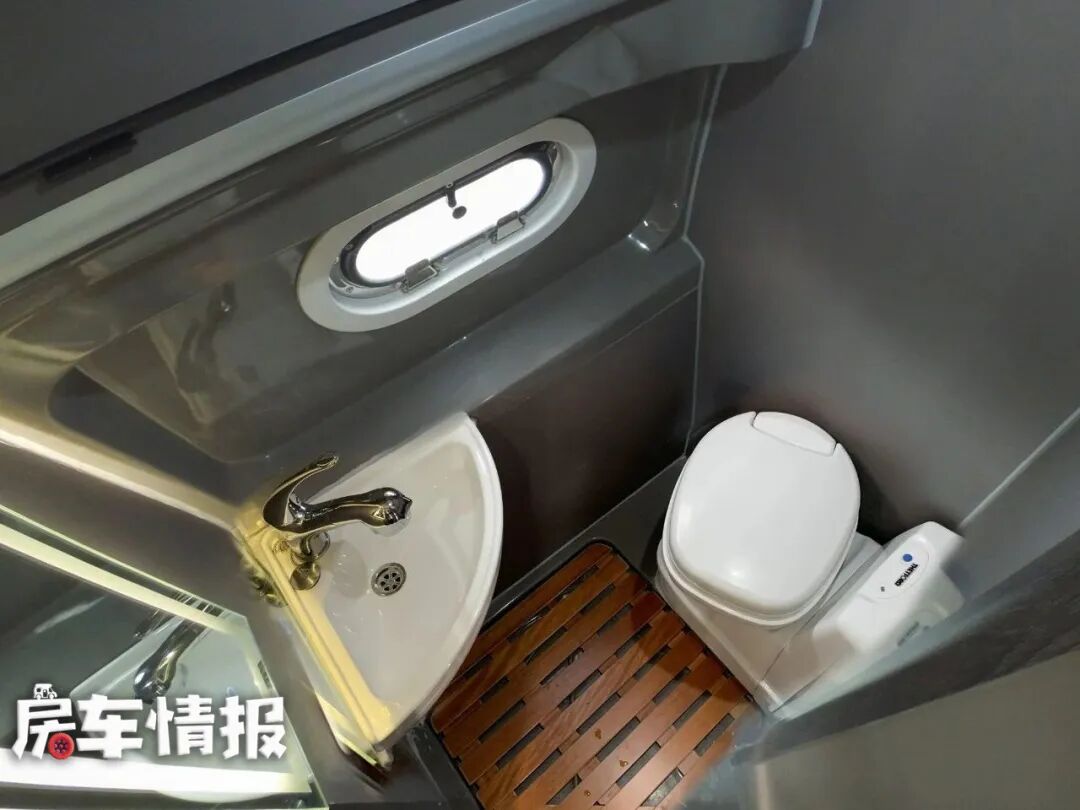 卫生间在车身左侧,空间虽然不大,但是一名成年人站在里面是没有问题的。内部装有防水木地板、赛特福德旋转马桶、换气扇以及一个带有背光功能的大梳妆镜,水龙头可以拔出,这样就可以当做淋浴花洒使用了。