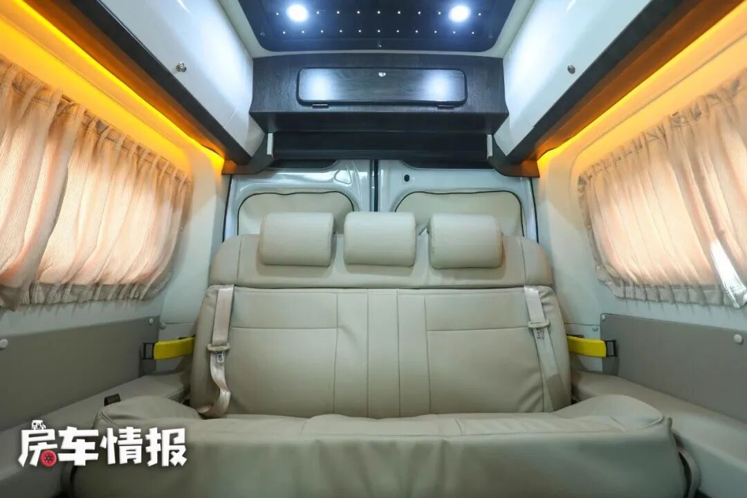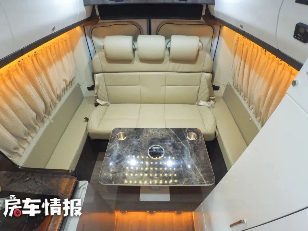 走到车尾,便是本车的大会客区,由一个可升降餐桌和三人大沙发组成,两侧的窗户都配有窗帘,两侧有暖黄色灯光的灯带,顶部还有蓝牙音箱和可控制的星空顶灯,让车内的生活更有意思。