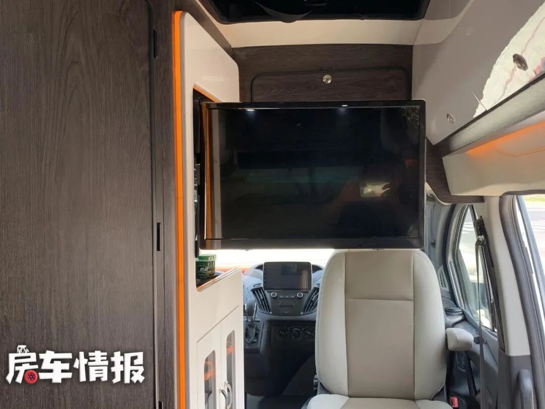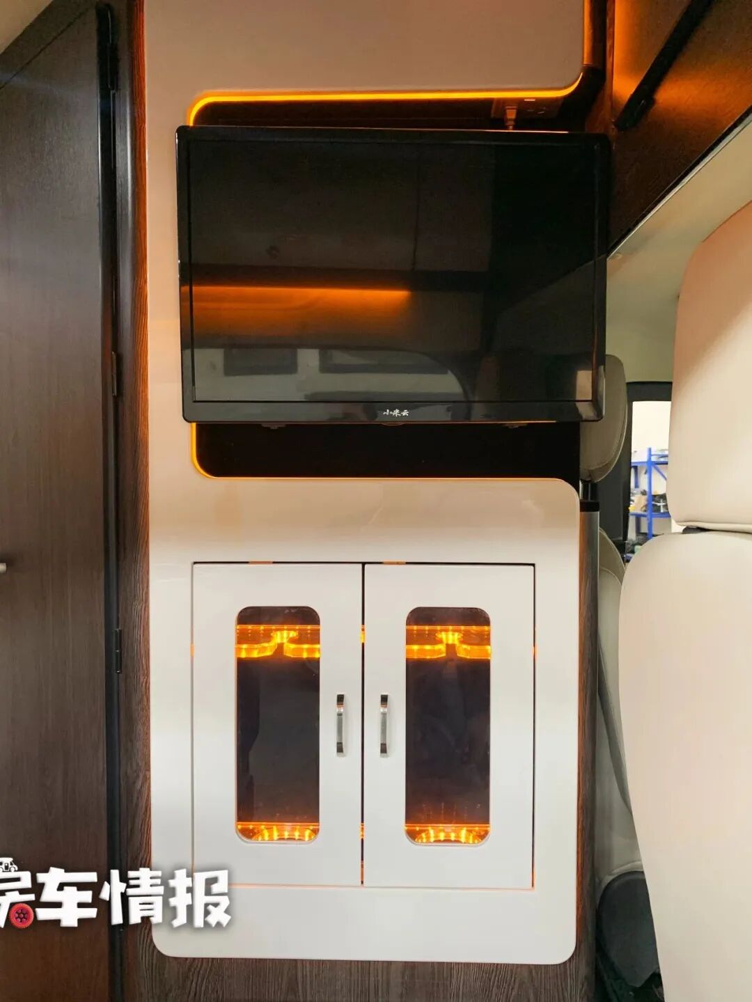 酒柜上方还装有一台24寸的小米电视,为大家提供了更多的车内活动。