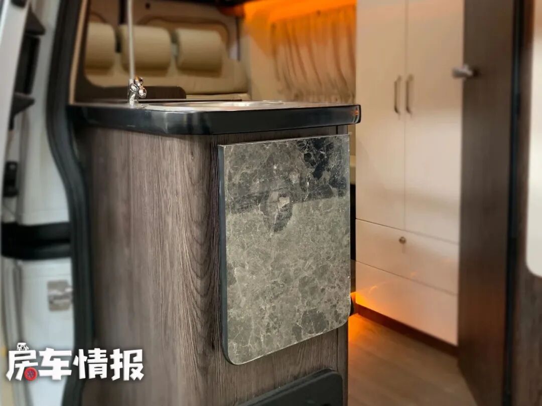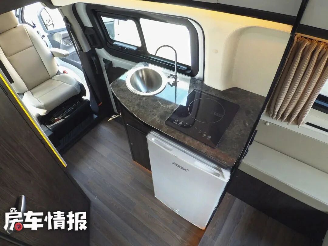 厨房区在中门左侧,装有洗菜池、电磁炉,桌面下方还有90L的冰箱,桌面右侧还有一个折叠小桌板,延长了桌面的使用长度,不过旁边就是会客区,大家可以携带卡炉在车外炒菜,避免油烟对车内的污染。