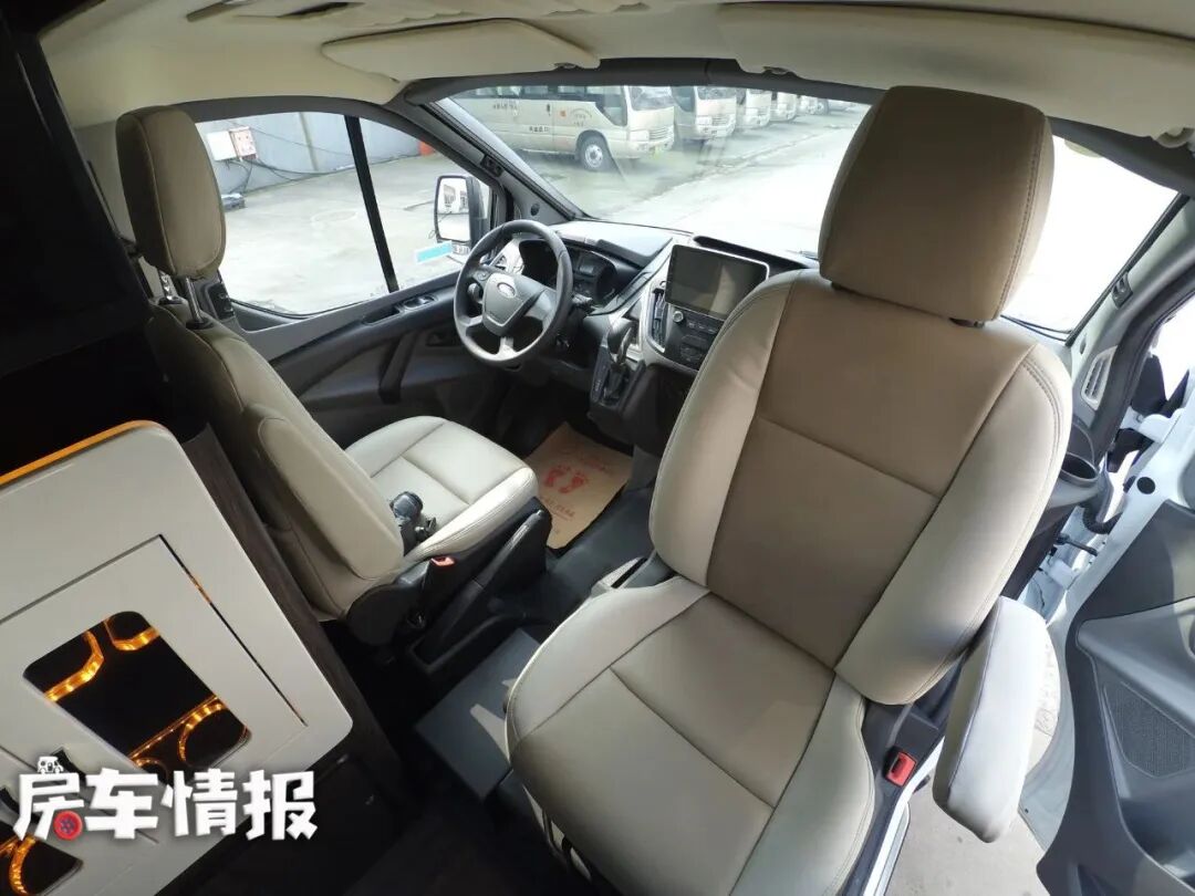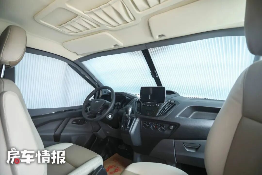 驾驶室内视野很好,三面玻璃处装有进口的遮阳帘,夜晚休息时可以更好的保护车内隐私。中控台处装有一台7英寸的液晶显示屏,带有GPS导航、倒车影像等功能,更加方便驾驶。副驾驶座椅可以旋转到后方,与生活区的朋友进行交谈。