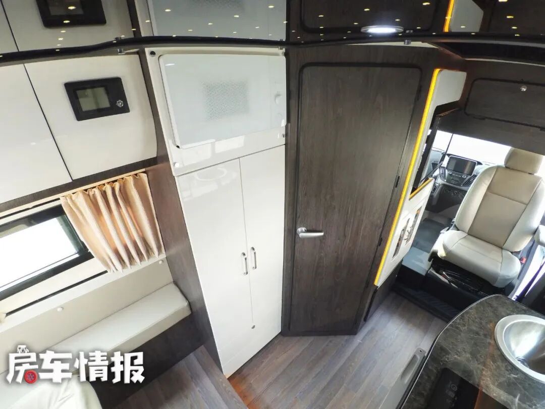 从中门进入生活区,可以看到车内的设计与其他房车与众不同,由前到后依次为卫生间、厨房、会客区,还有顶部的升顶床。整车使用进口PVC地板,并且做了隔音降噪处理、隔热处理,让车内的生活更加惬意。