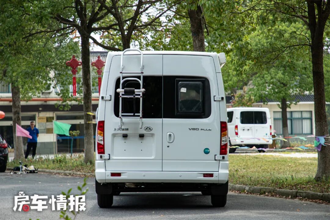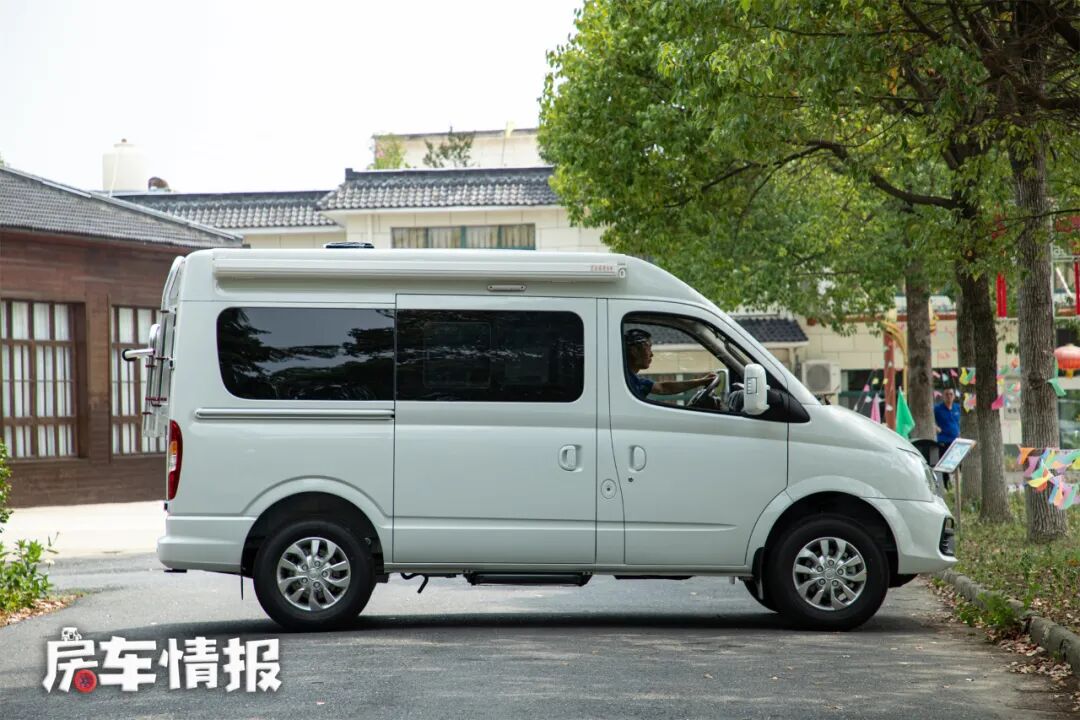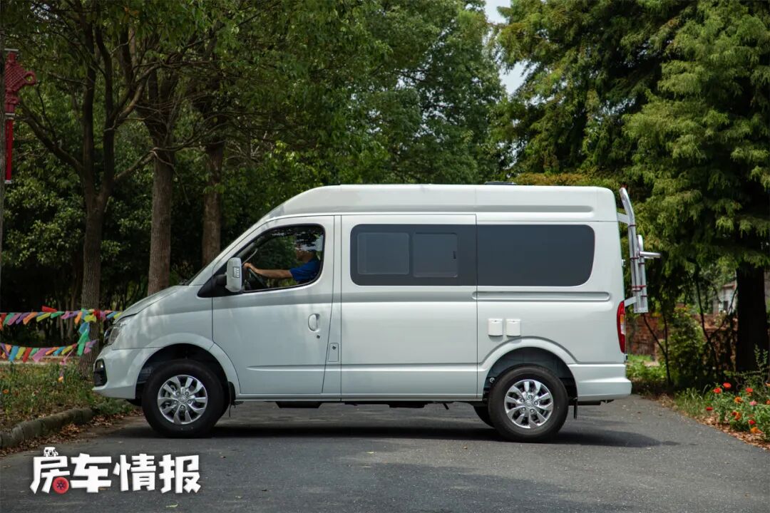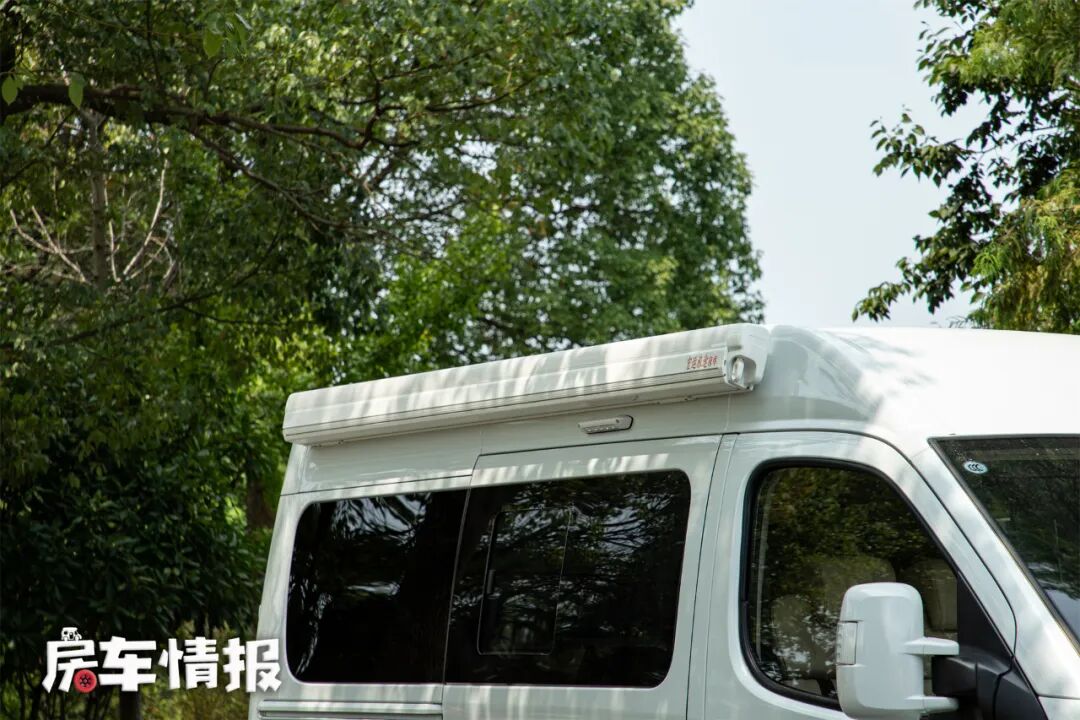 车身外侧为白色,装有隐私玻璃,车厢外做了保温隔音的处理,让车内生活更加舒适。左侧有水电接口,车尾可选装爬梯,方便上到车顶进行检查。右侧装有2.5m遮阳棚,相比其他车型要小,这也是由于车身本就小的原因。