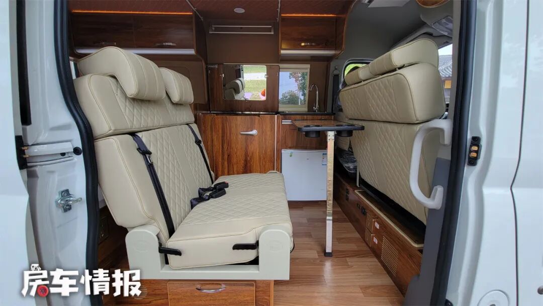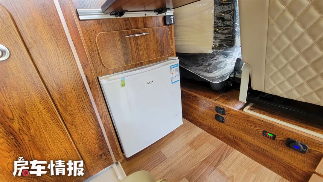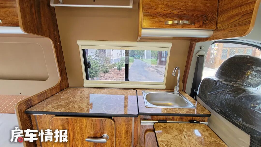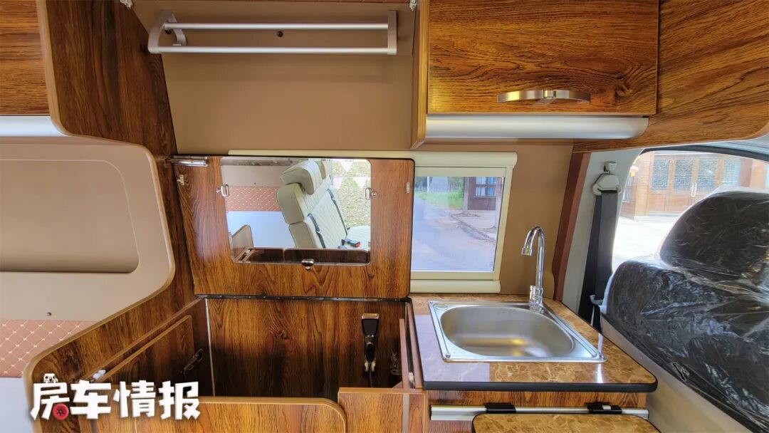 厨房在主驾驶后方,有洗菜池、水龙头,左侧还有一个大的操作空间,下方还有一台50L的冰箱,可以存储出行的食材,足够一家三口两天的食材。