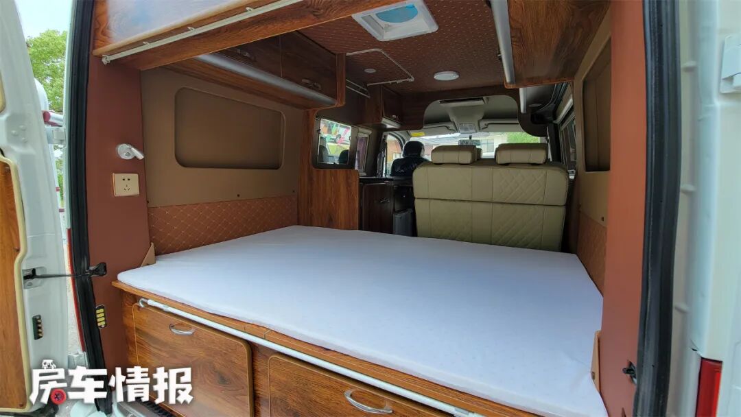 后尾床尺寸为1800*1250mm,床铺上方可选装12V直流空调,为车内尤其是床的部分提供凉爽的空间。床周围采用软包材质,不用担心孩子的磕碰。顶部还装有储物吊柜,床上有充电接口、阅读灯,顶部装有换气扇,可以保证车内外的空气流通。床下有8L的恒温热水器,可供车内使用。