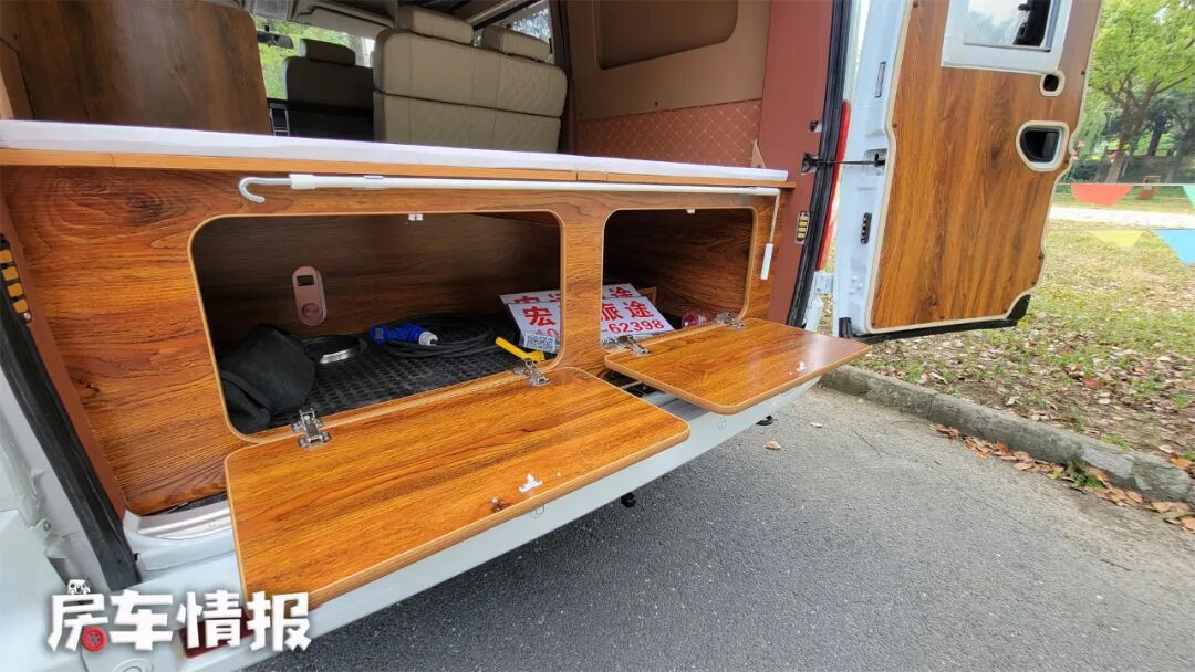 打开车尾门,可以看到床下还有两个储物舱,内部是贯通的,可以存放一些行李。右侧可以将餐桌安装上去,这样就可以在车外就餐了。