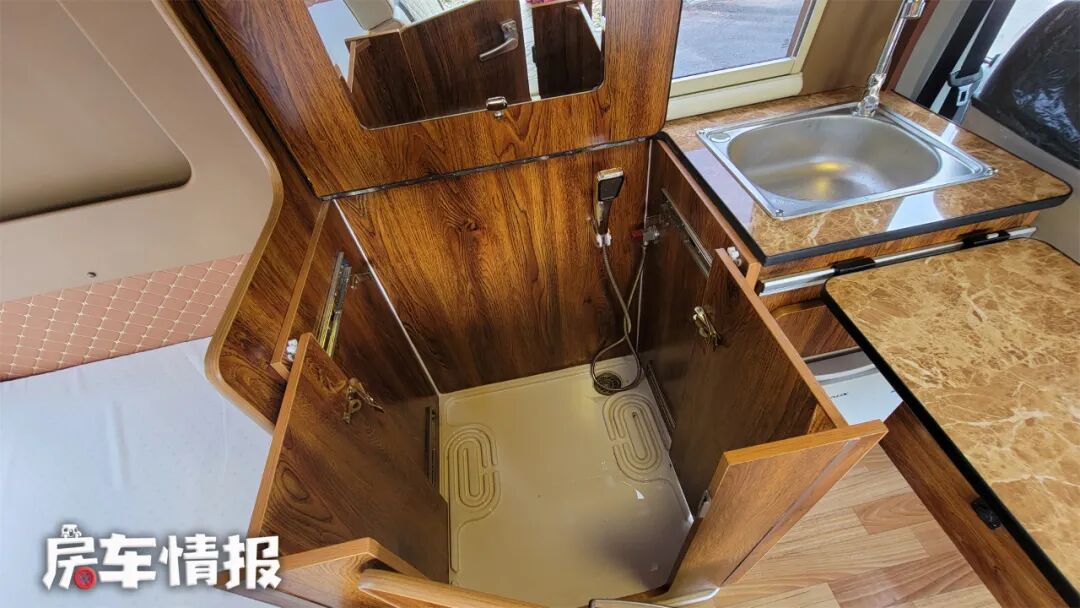 左侧的操作台下方,便是本车隐藏的浴室,将操作台翻折起来,就可以看到梳妆镜和淋浴喷头了,后期可以加装防水隐私帘,这样就可以在车内简单的冲凉了。