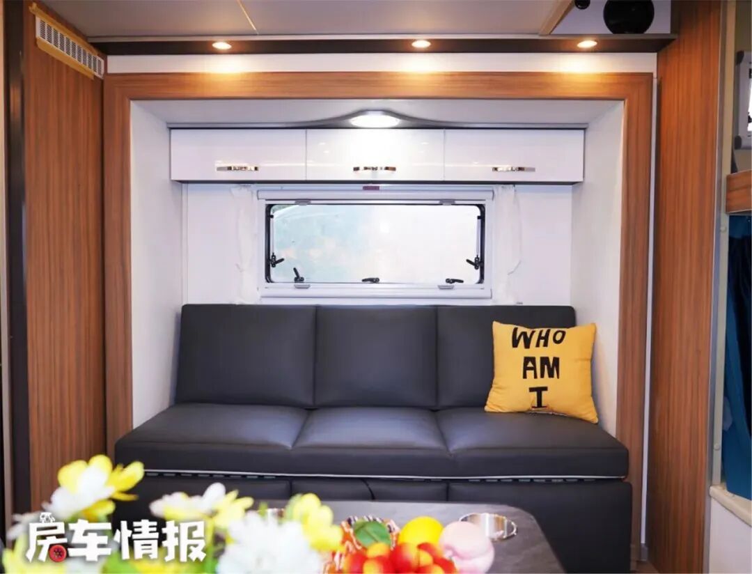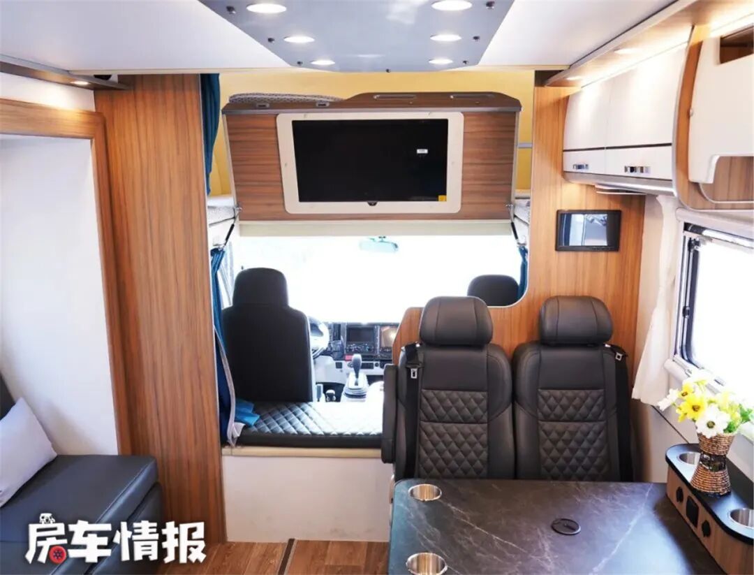 本车尺寸为5990*2300*3180mm,也是一款在6米限制内做到了最大化长度的房车,这样的尺寸为车内提供了更多的空间。虽然外观上还有一些平台车的样子,但是在车头的位置做了一些曲线的处理,让这辆车看上去不是那么的呆板了。车内核载6人,C本即可驾驶。