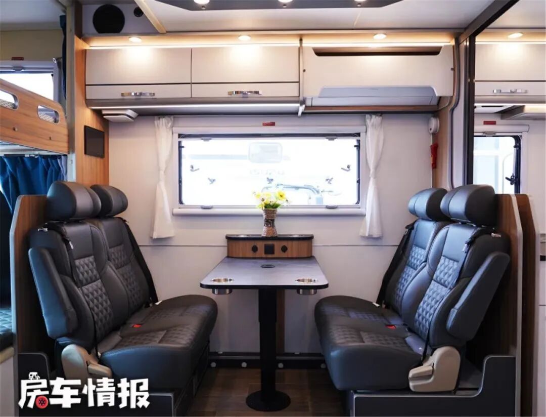 会客区的空间非常宽大,右侧是一张可升降餐桌和对坐式卡座沙发,座椅采用乘用车款式,带有安全带,行车时也可以乘坐,还可以对前后和靠背进行调节,厚实的坐垫坐上去也十分舒服。在顶部的柜子里,还有一台空调,为了整体的美观,将其隐藏在了吊柜中,看上去整体性更强。