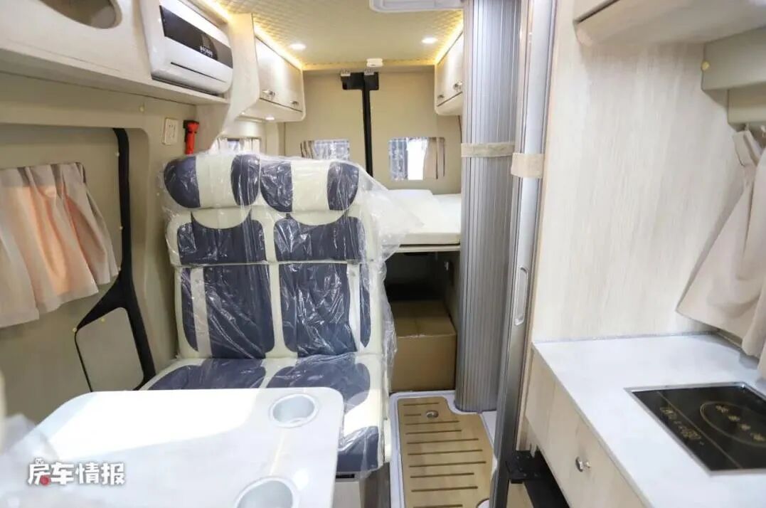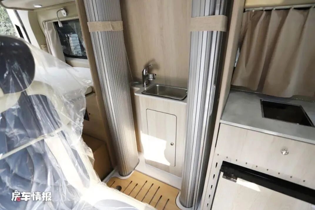 车内生活区高度为1700mm,在车内走动或做饭时不能站直还是有些麻烦的,但是车内配置还是比较完善的,有会客区、厨房、卫生间和车尾1700*1300mm的横置双人床,会客区可以变成一张2000*800mm的单人床,也可以满足3人的睡眠空间。