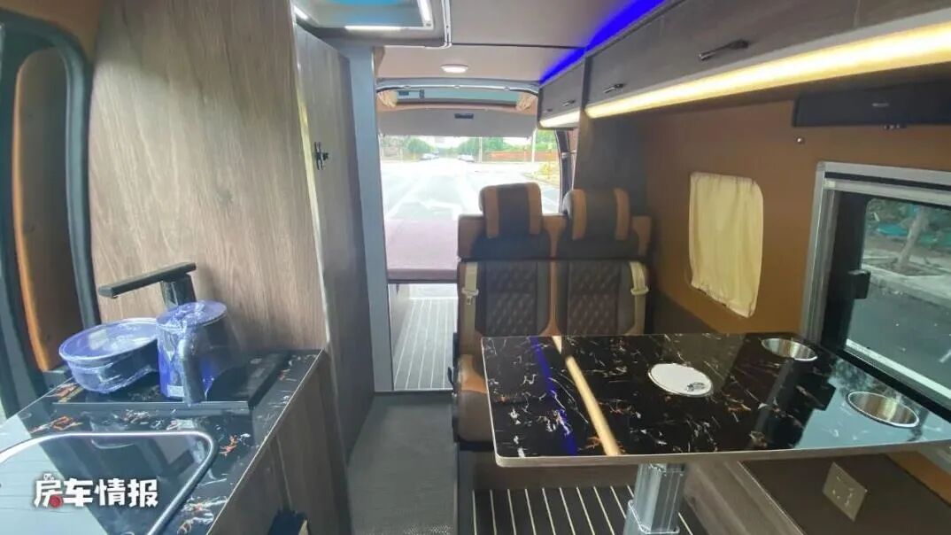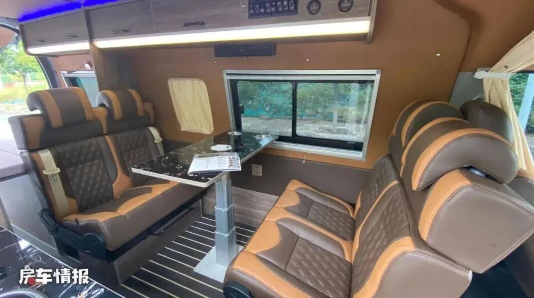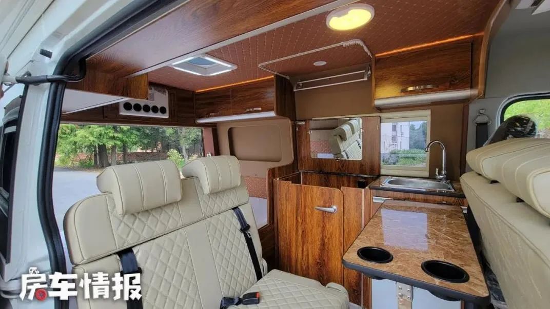 本车搭载的是一台2.4L汽油发动机,与之匹配的是5速手动挡变速箱,最大功率为118kW,最大扭矩为230N·m,核载6人,C1本即可驾驶。车身有金色拉花装饰,让这辆车看上去更加动感,外侧还装有遮阳棚、外置抽拉式厨房和水电接口,方便了大家的车内外生活。