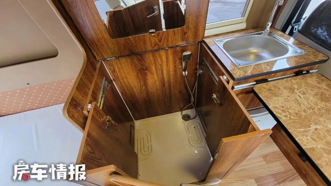 在卫生间的左侧操作台下方,藏有本车的淋浴间,装上防水帘后就可以在里面简单的冲凉了。