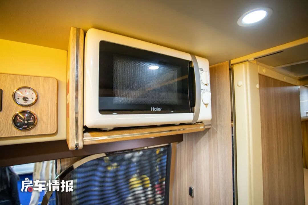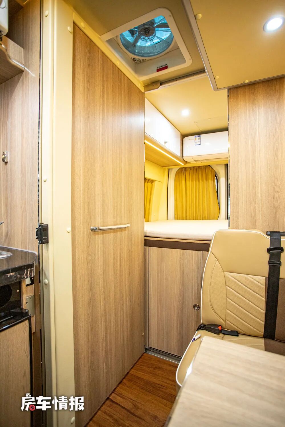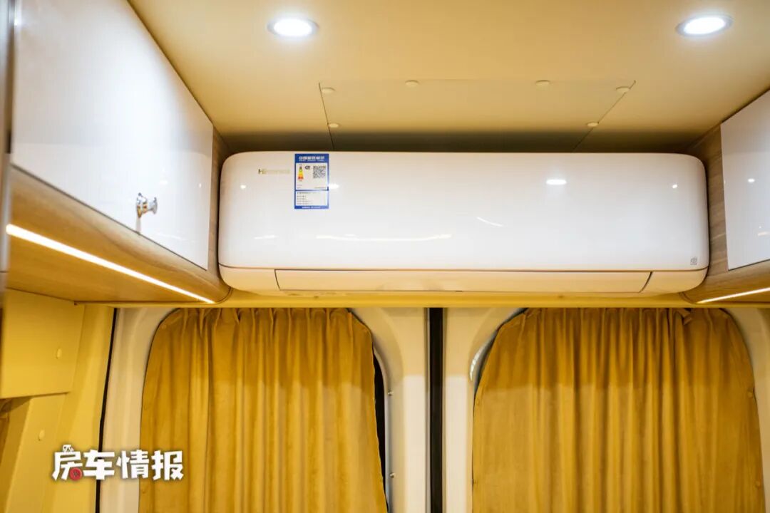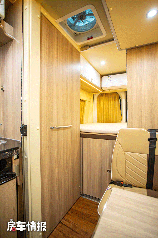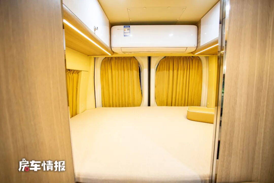 床头床尾的上方各提供了一个大号的储物吊柜,平时可以存放衣物,也方便拿取。车尾的顶部则安装了一台家用变频空间,随时调节车内温度。
