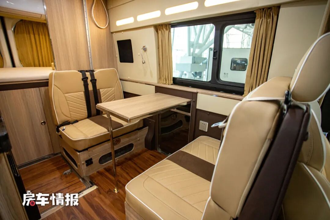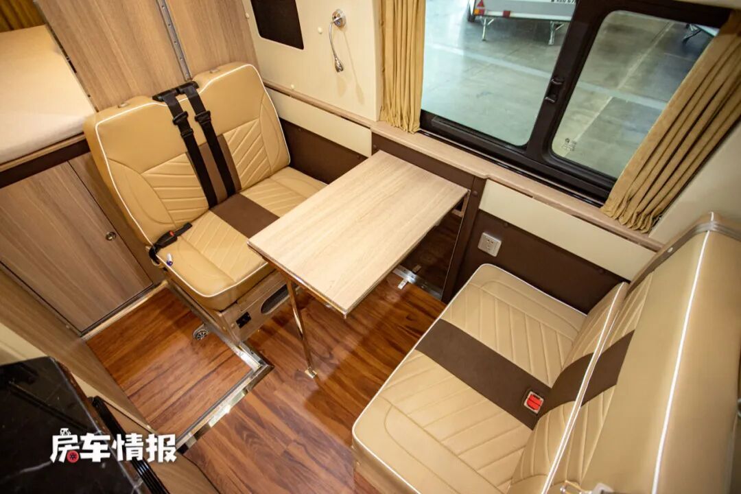 会客区采用了对坐沙发的设计方式,沙发座椅同样采用了皮质软包工艺,并配备了四条安全带,平时行车时也可以坐人。中间提供了一个可折叠的小茶几,基本的吃饭问题还是可以解决的。