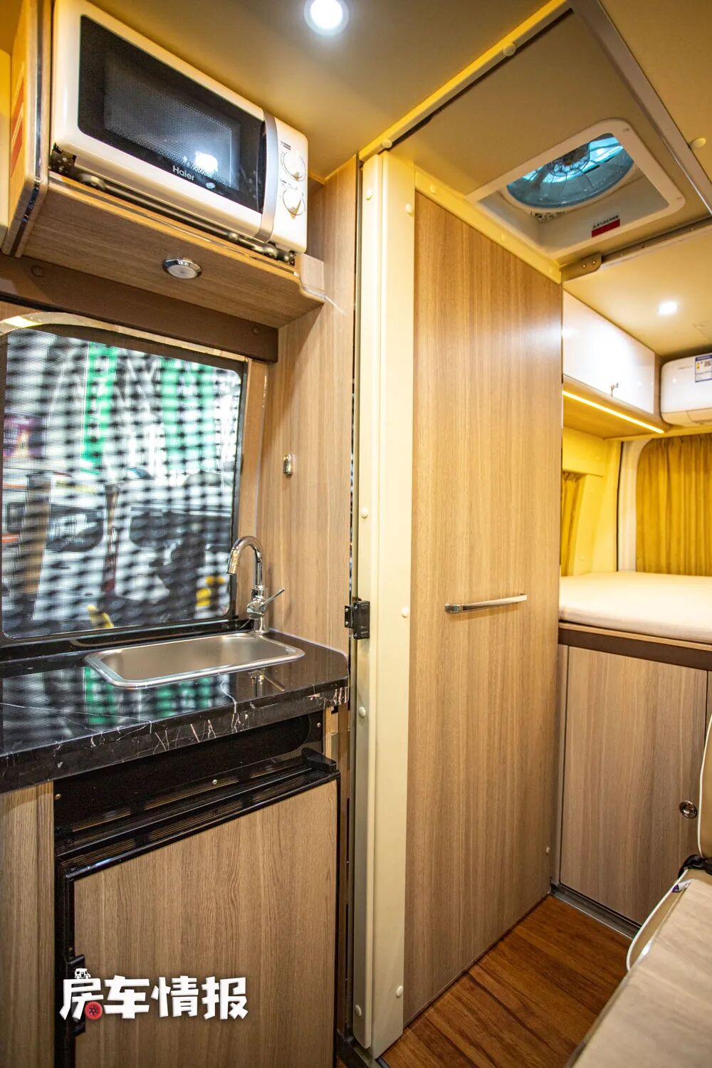 临近乘客门处是一个小型的橱柜,台面上只提供了一个不锈钢水槽,不过台面的边缘有一圈小边框,防止溅水外流。