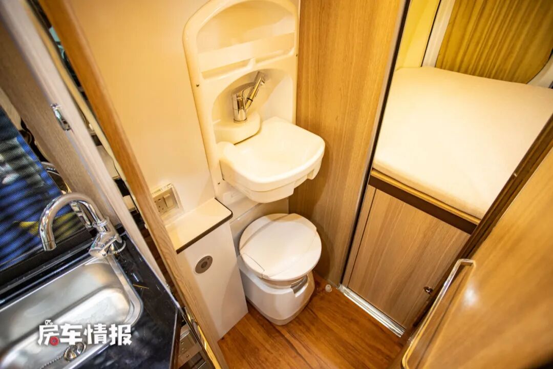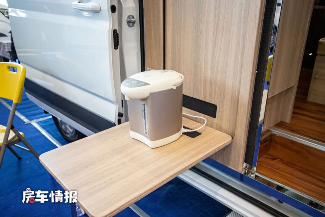 这款房车虽然在车内没有提供电磁炉,但是平时做饭可以使用车外的抽拉燃气灶,也杜绝了油烟问题,另外在橱柜的外侧,还提供一个可翻折的小桌板,并配备了电源插座,根据自身需求也可以外接厨用小电器。