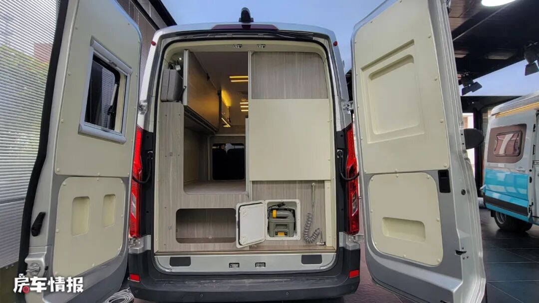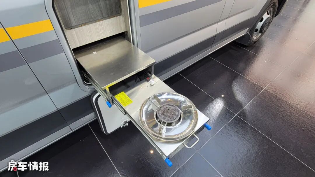 车身外部提供了齐全的户外配件,包括遮阳棚、水电接驳口、行李舱和外置的抽拉灶台,这样在天气好的时候,也能够在外烹饪聚餐,享受休闲的时光。