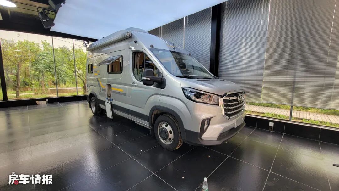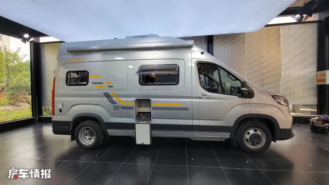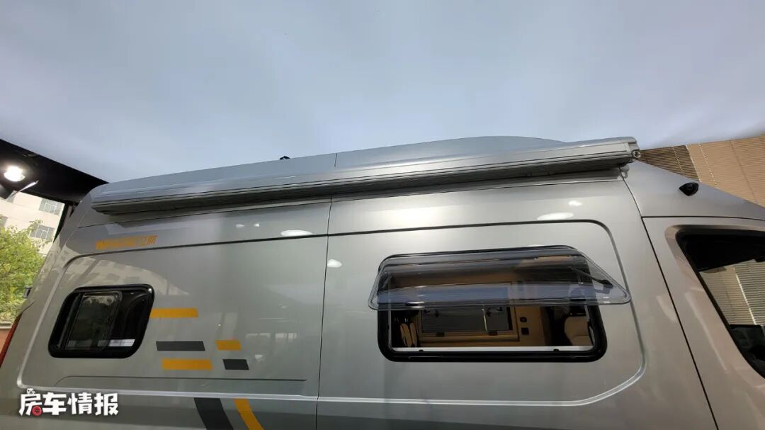 这款车是搭载了大通V90底盘所打造的,得益于无中门的设计,整辆车的外观看起来更加的完整简约,车身采用了豪华感十足的金色,也提升了整体的质感,在车身尺寸方面,全车的长宽高分别为5940*2100*2785mm,和主流的B型房车保持一致,为日后的上路通过带来了一定的优势。
