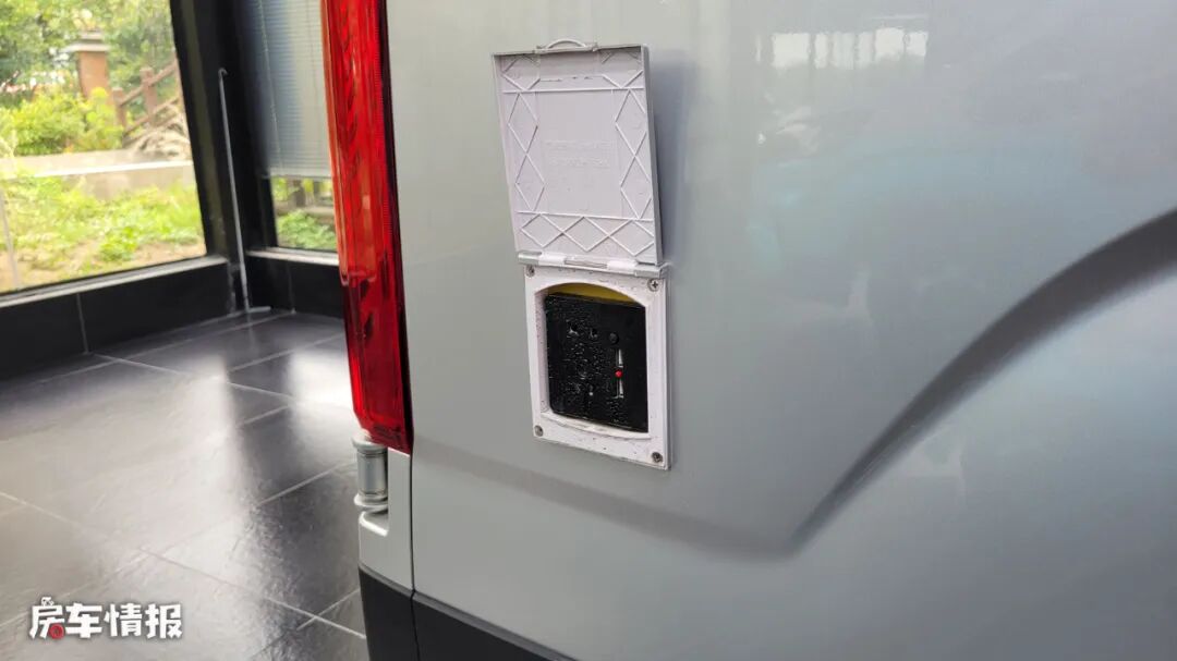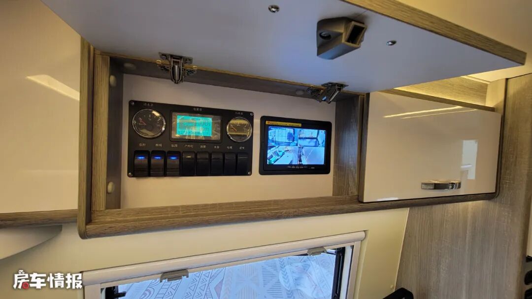 电路上,这款车是带有12V的电路系统,配有3000W的逆变器和800Ah的锂电池;水路上则提供了150L的净水箱和50L的灰水箱,对于日常的用水用电需求还是能够满足的。
