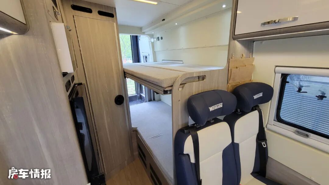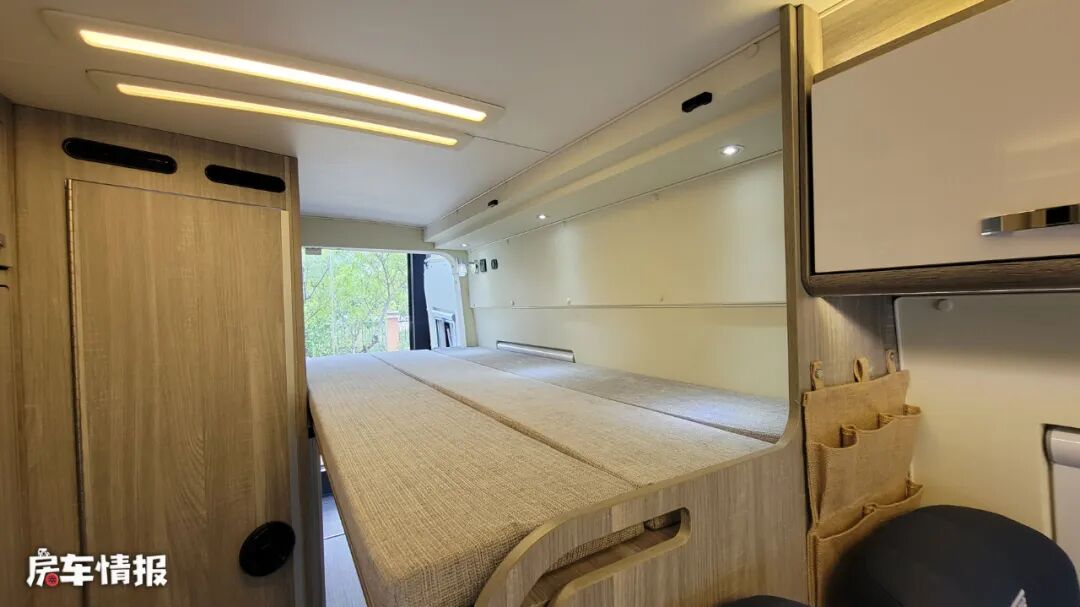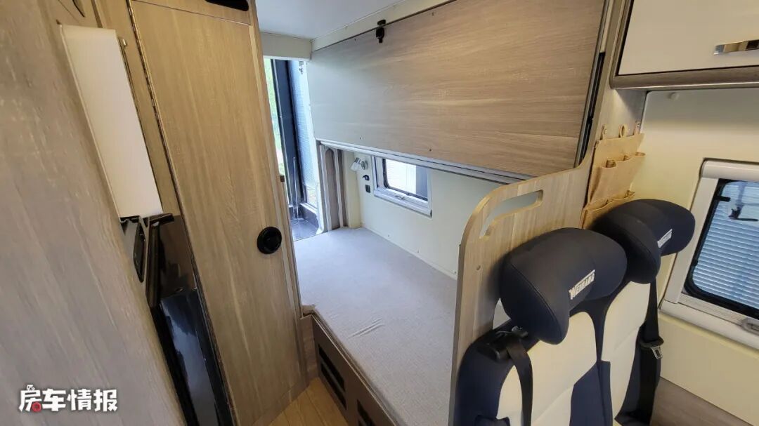 会客区后方则是全车的睡卧区,整体采用上下铺的设计,下铺尺寸为1950*900mm,上铺尺寸为1850*750mm,在不用的时候还可以向上翻折为下方预留出更多的空间。