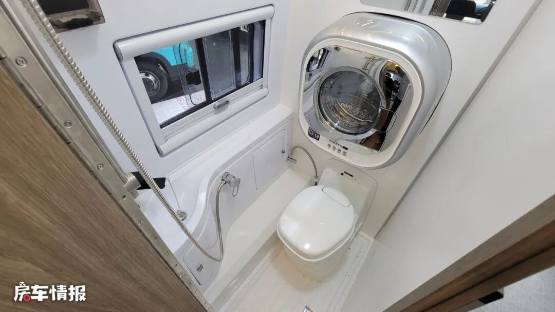 旁边则是整辆车的独立卫浴室,内部提供了马桶、独立的淋浴花洒、洗衣机、洗手台盆等,日常的洗漱和如厕问题都是能够满足的。