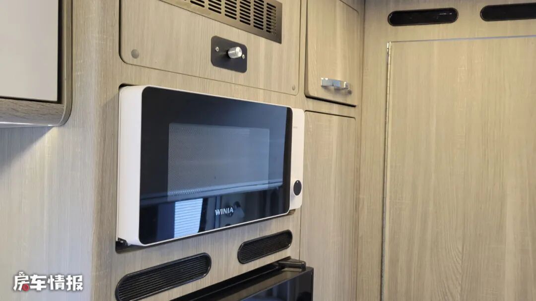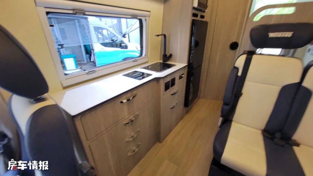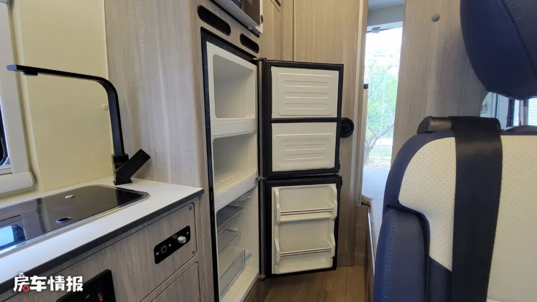 得益于无中门的设计,全车的厨房操作台尺寸还是非常大的,提供了足够的空间满足后期的备菜烹饪等需求,台面上提供了基础电磁炉和不锈钢水槽,后方则放置了微波炉和一台133L的双开门冰箱,能够满足日常分类存放食材的需求。