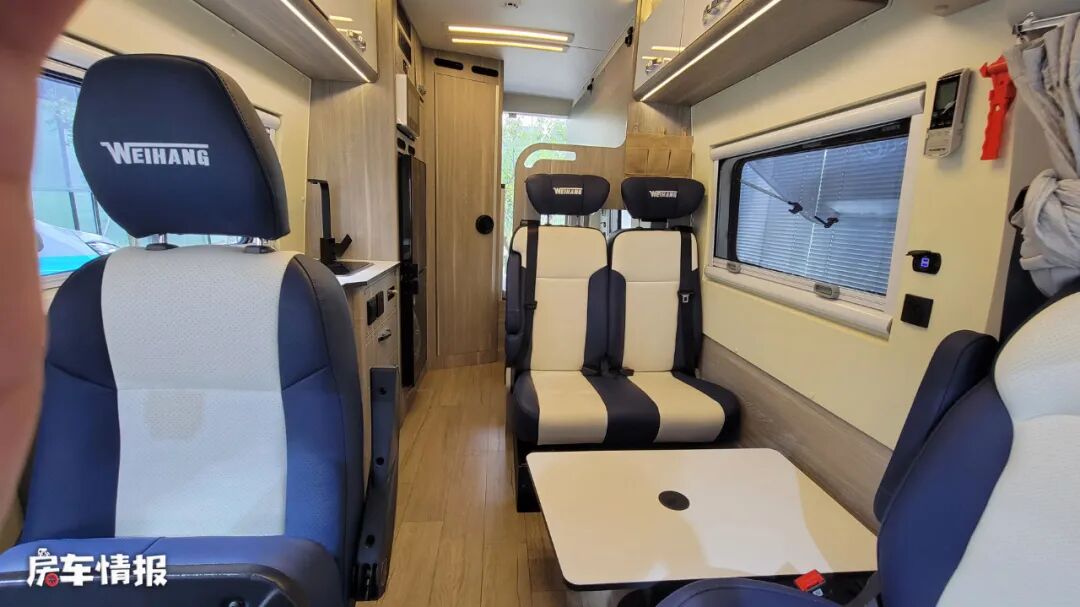 进入车厢内部,整体的设计还是比较现代简约的,内高能够达到1.98米,对于一些身高较高的人来说,也可以满足正常的站立行走和活动。