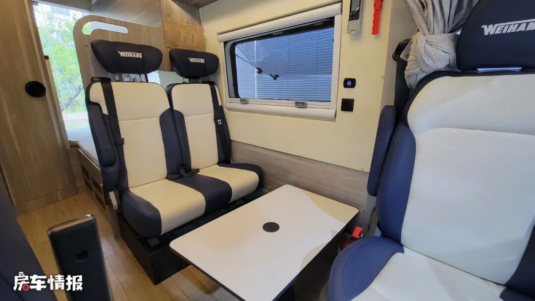主驾驶座椅后方是全车的会客区域,采用连排座椅+餐桌的设计,加上可以向后旋转的主驾驶座椅,则可以变成一个面对面的布局模式,日常无论是商务洽谈还是就餐都没有问题。