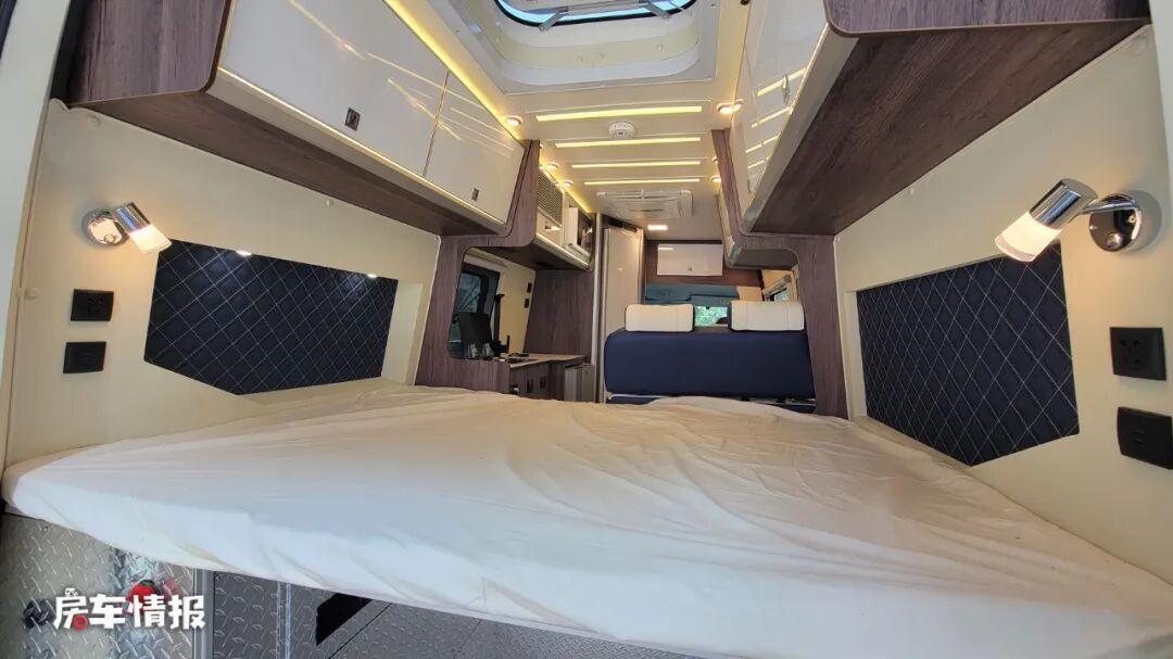 最后就是位于车厢尾部的横置双人床,其整体尺寸为1880*1240mm,能够满足两个成年人的需求,两侧顶部还配有基础的吊柜,可以 用来存放日常需要换洗的衣物。