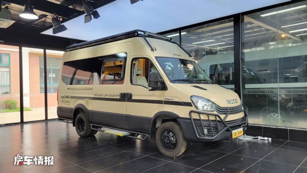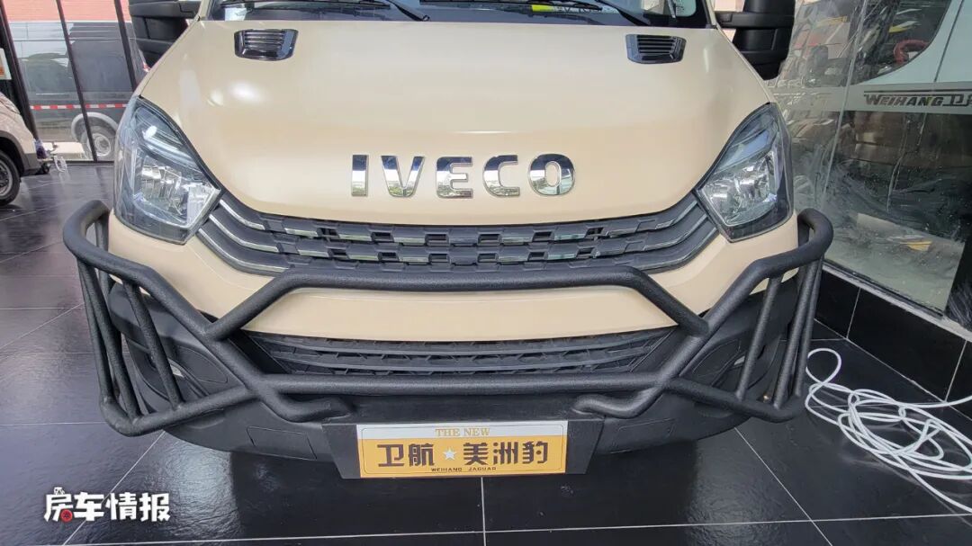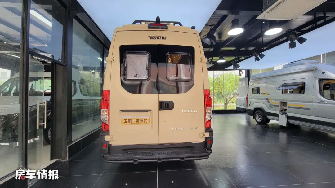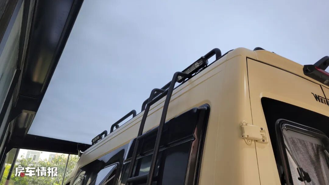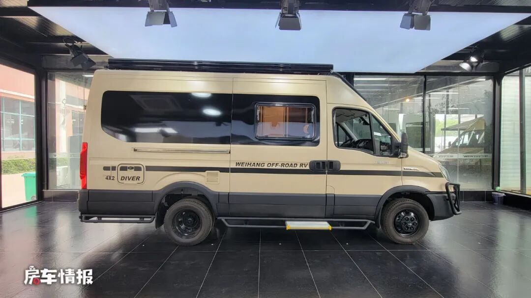这款车是一款基于依维柯欧胜底盘所打造的B型房车,和主流的B型房车相比,也属于较少数,整车的外观特别有美式VanLife的感觉,是以金色涂装的,加上黑色的线条,再搭配上前方醒目的保险杠、户外射灯和登车爬梯,颇有运动越野范儿,后期还可以加装一个带有保护栏的观景台,这样就能够享受在车顶看风景啦。