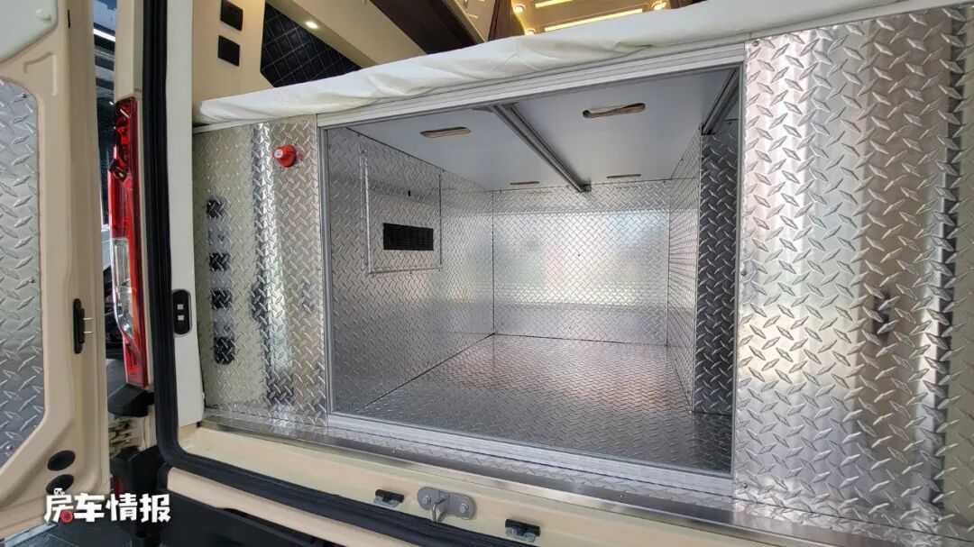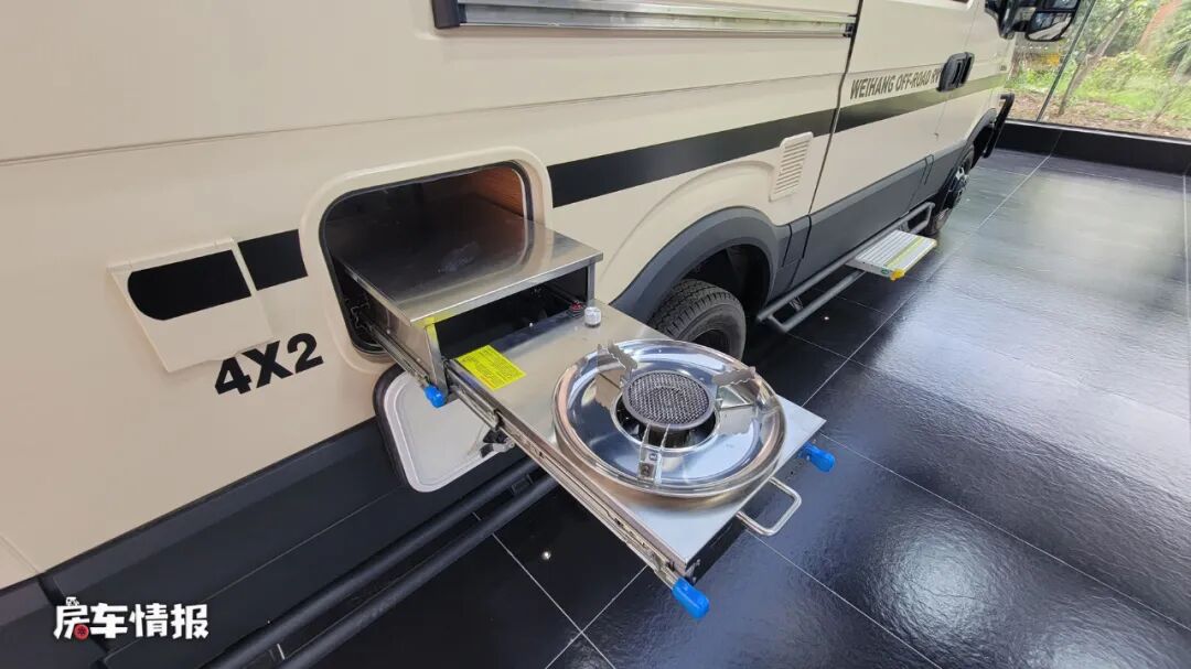 车身外部除去配置了基本的手动遮阳棚、外置抽拉明火燃油灶之外,在后方还进行了盲窗式的设计,这样也能够更好的保证内部的隐私空间,左侧玻璃还带有外凸式的拓展,也可以提升内部的使用空间,另外这款车还采用了后双胎的设计,对于日后行驶上路的稳定性和承载性,都给予了一定的提升。