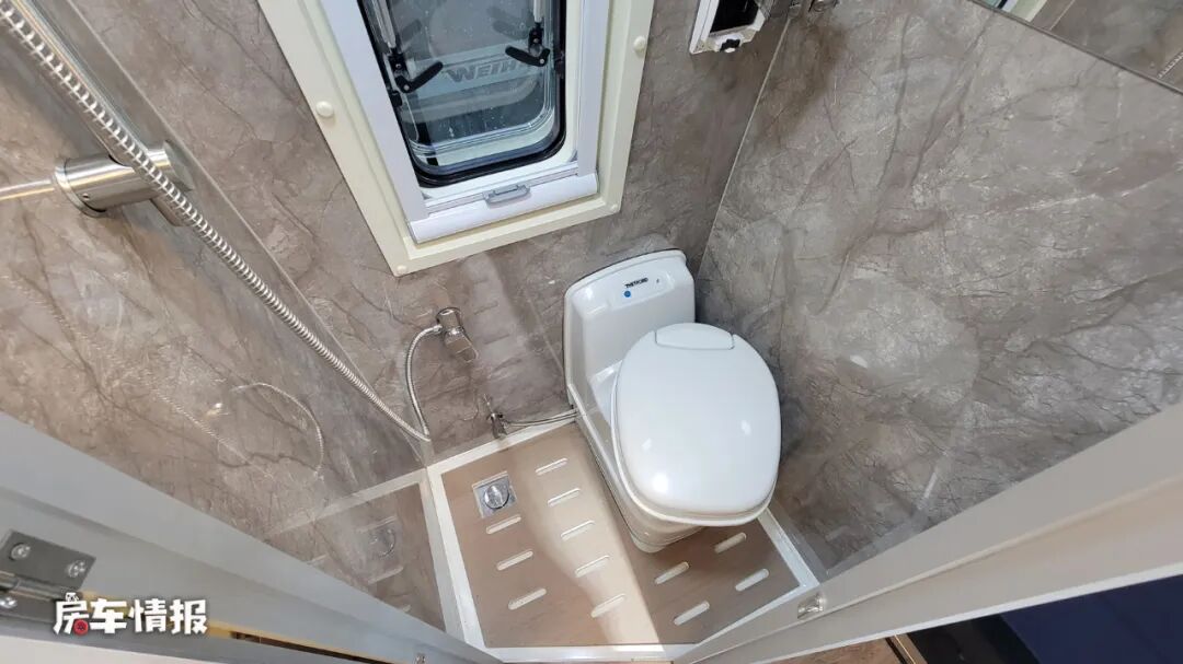 整辆车内部的布局设计还是和主流的B型房车有很大不同的,像这款车的独立卫浴室,是位于车厢最前方,也就是主驾驶座椅的后方,靠近会客区的地方,内部空间有些狭小,如果后期能够取消向后坐的单人座椅,也许能够拓展一些更大的地方,不过还是配置了马桶、淋浴花洒、梳妆镜等一些基础的设施,可以满足日常的洗漱如厕需求。