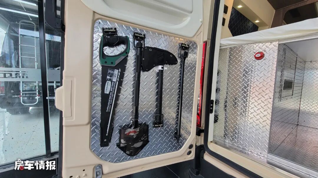 还有一个比较有意思的是,在左侧车门壁上,还配置了一些户外工具,比如工兵铲等,可以为野外露营提供一定的便利度。