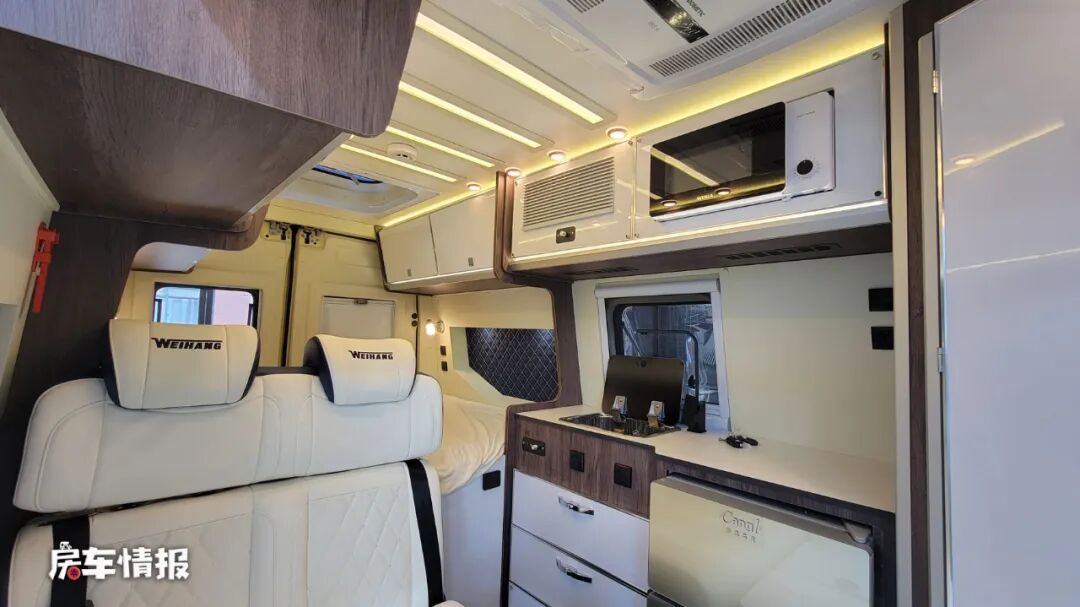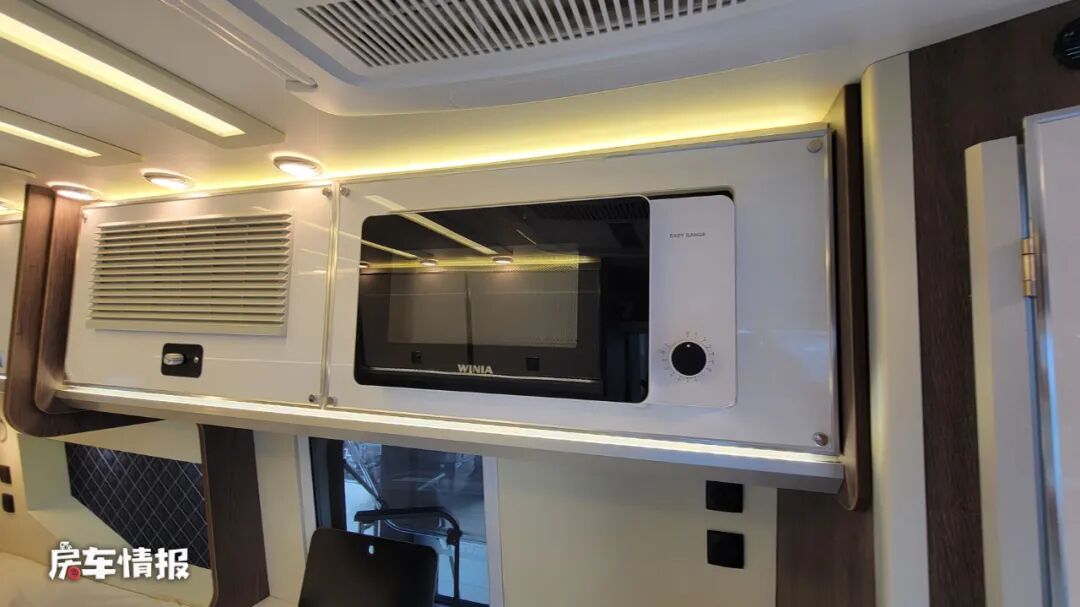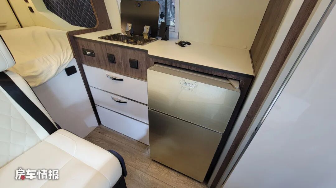而全车的厨房区则是在卫浴室的后方,整体的面积比较中规中矩,提供了基础的不锈钢水槽、108L双开门冰箱、微波炉等,可以简单的备菜或者热一些饭菜。