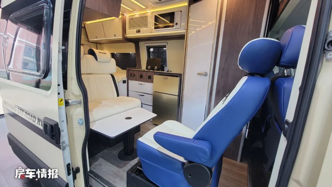 这是一款核载六人的车型,除去驾驶室的三人座椅,后方的会客区域采用了1+2对卡座形式的设计,中间配有一台可升降的餐桌,不过个人觉得,如果后期只选择双人连排座椅+升降餐桌,那么整体的空间可以更加的宽敞。