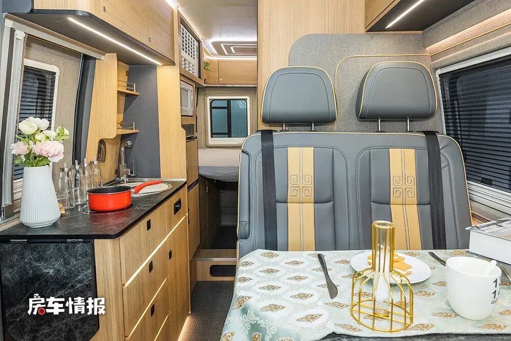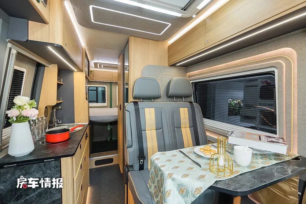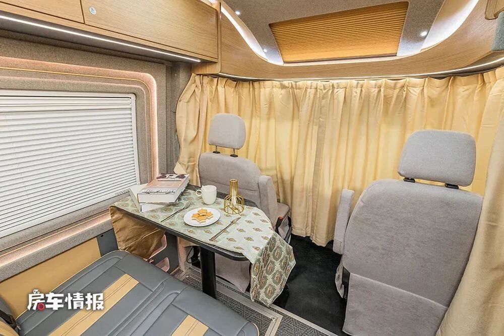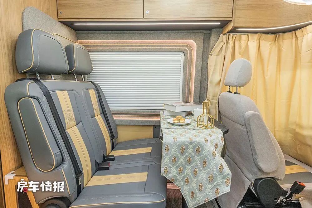 在驾驶室后方的会客区,是采用了双人连排座椅+餐桌的设计,座椅都是使用了乘用车级别的设计,带有头枕和扶手,填充度也很饱满,能够带来不错的乘坐感受,顶部还配有基础的吊柜,以满足日常物品的存放。