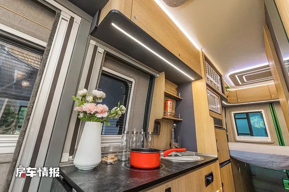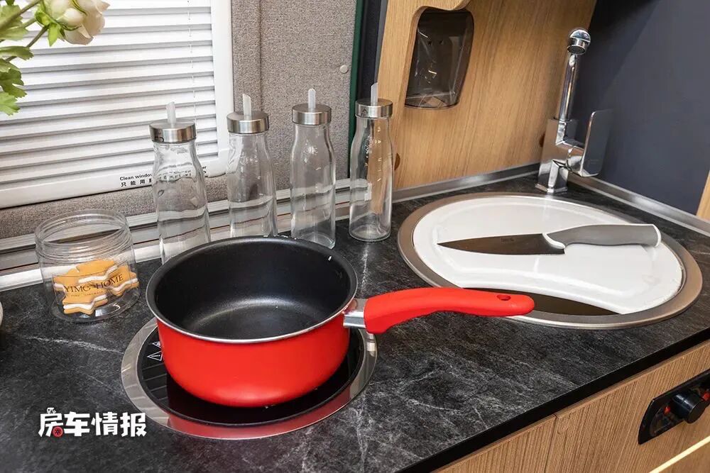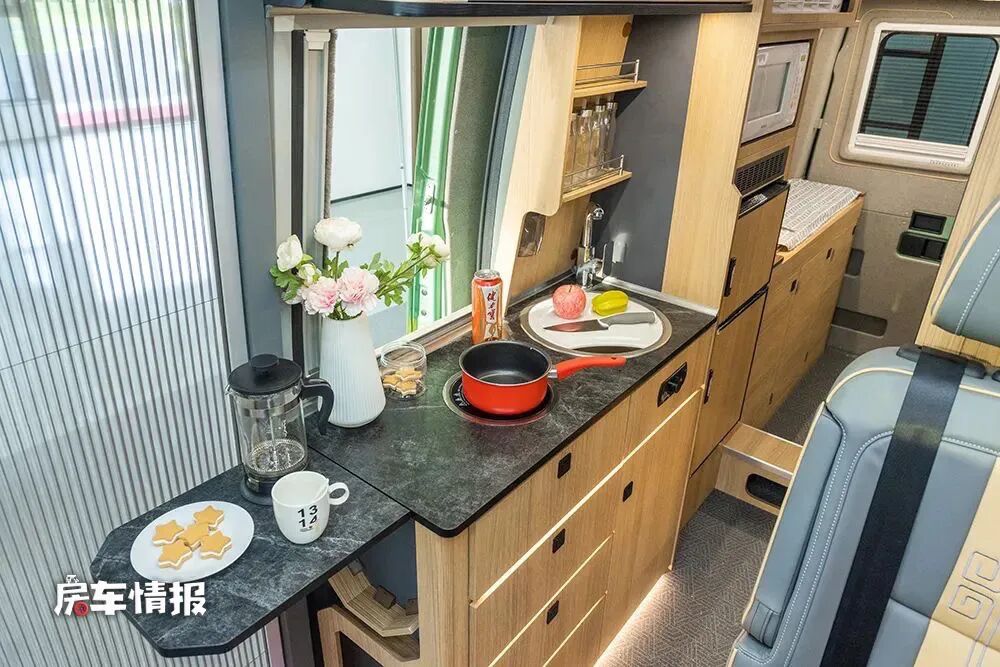 位于乘客门后方的是全车的厨房区域,前方为主操作台区域,台面上提供了不锈钢的水槽、电磁炉、置物架,侧面还提供了可以备菜的翻折桌板,后方是提供了一台85升冰箱和微波炉,能够满足日常的烹饪需求。