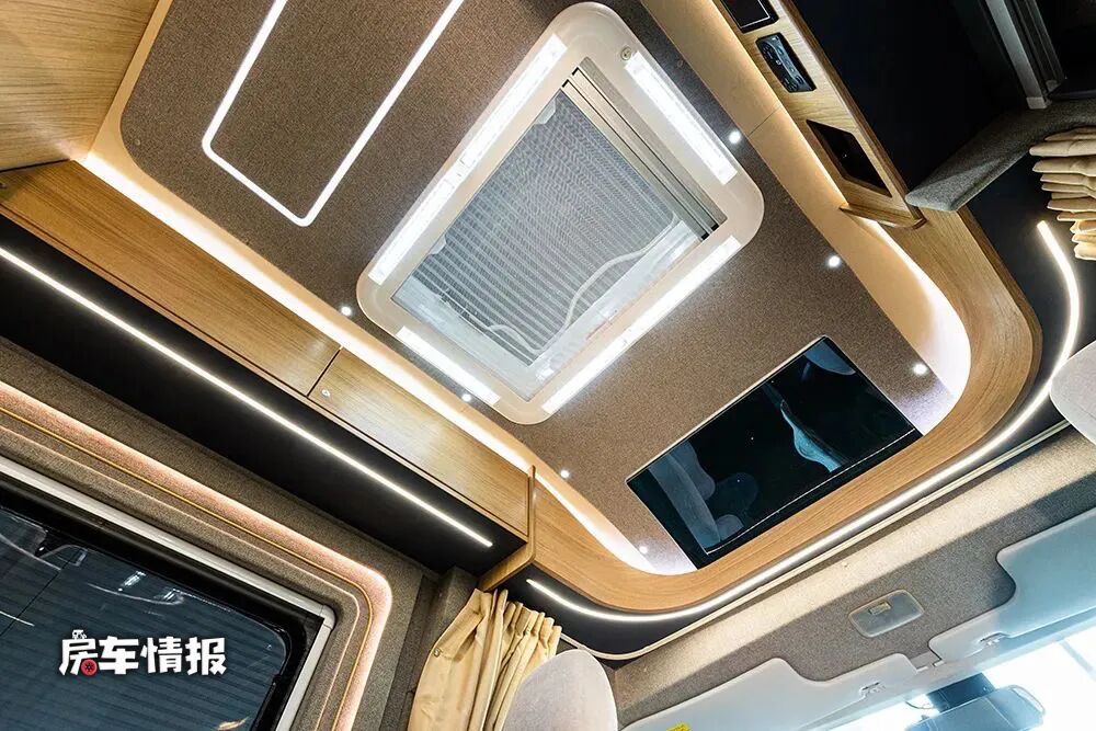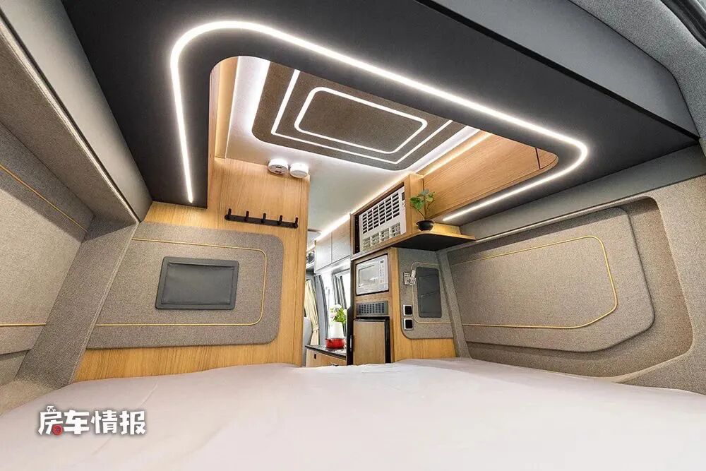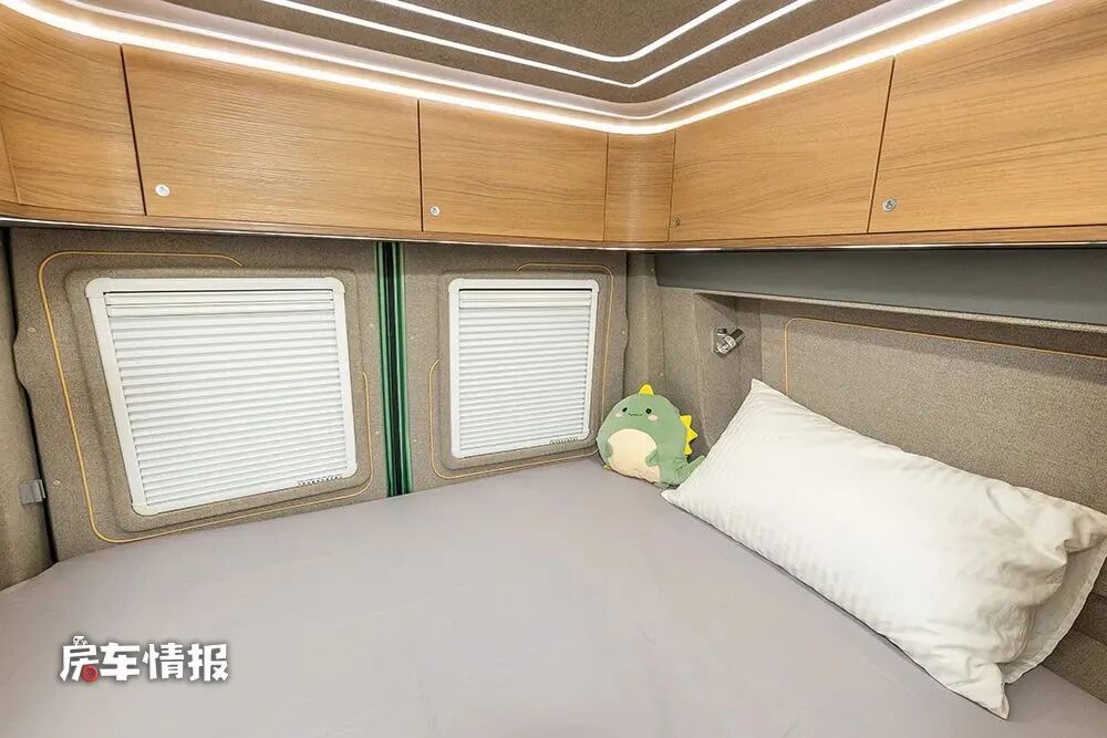 最后就是位于车厢尾部的睡卧区,顶部带有精致的顶灯设计,感觉就像和豪华酒店一样,四周还做了包覆设计,提供置物栏等,顶部还有储物吊柜的加持,能够满足日常存放物品的需求。
