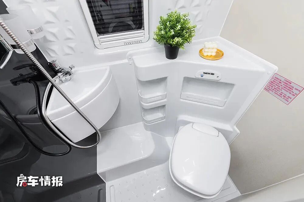 与其相对的是全车的独立卫浴室,内部采用了黑白拼色的设计,看起来非常的时尚现代,提供了可旋转的盒式马桶、洗手台盆、独立的淋浴花洒、梳妆镜、换气扇等,能够满足日常的洗漱如厕需求。