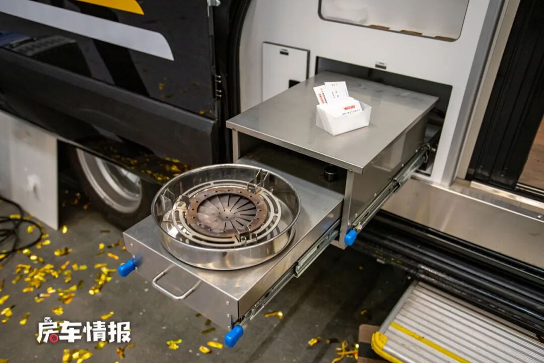 为解决车内大火猛炒会带来的油烟问题,这款房车还在橱柜的外侧下方提供了一个外置的抽拉燃气灶,能实现同时开火做饭,在日常使用时也非常的方便。