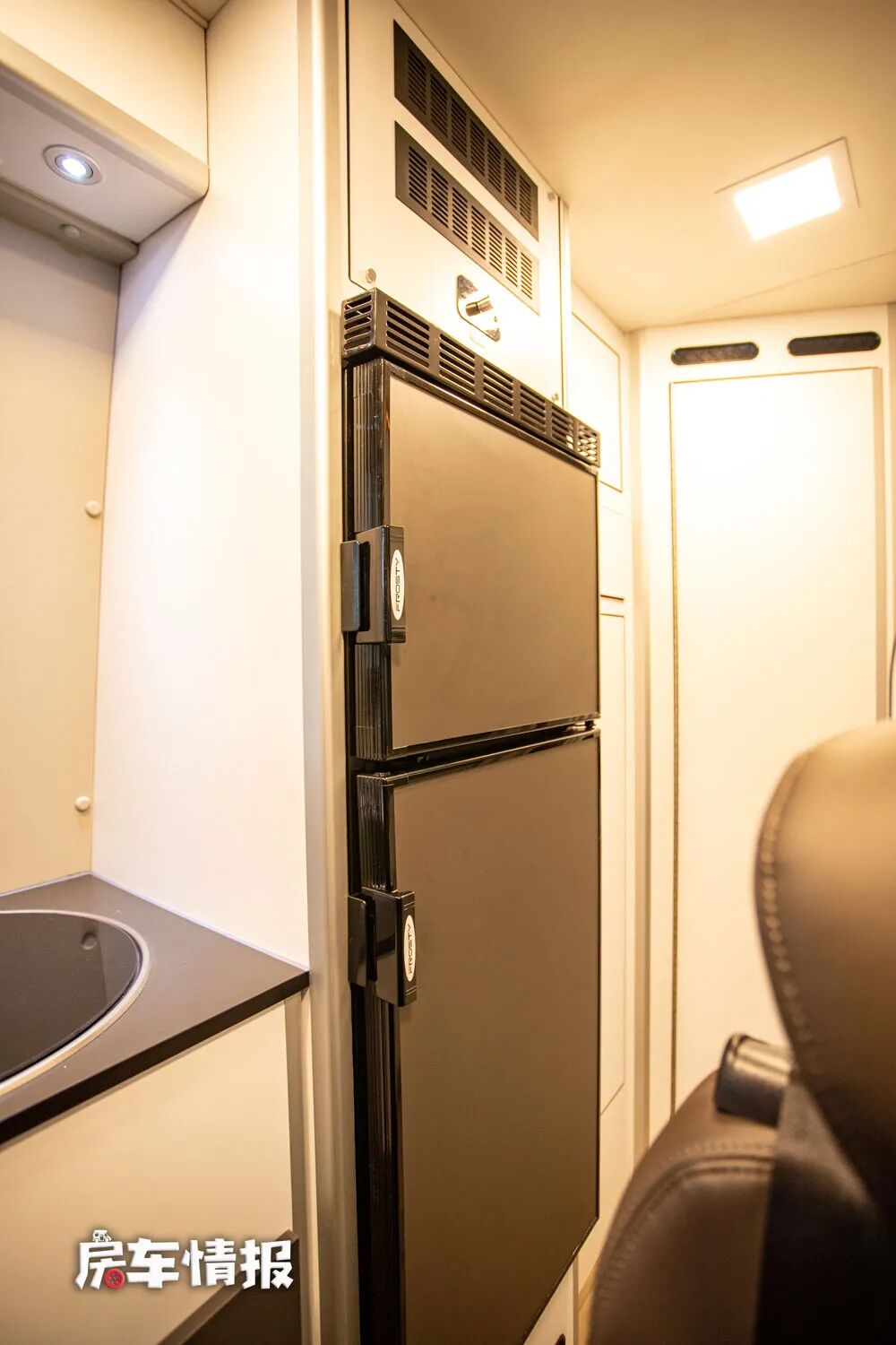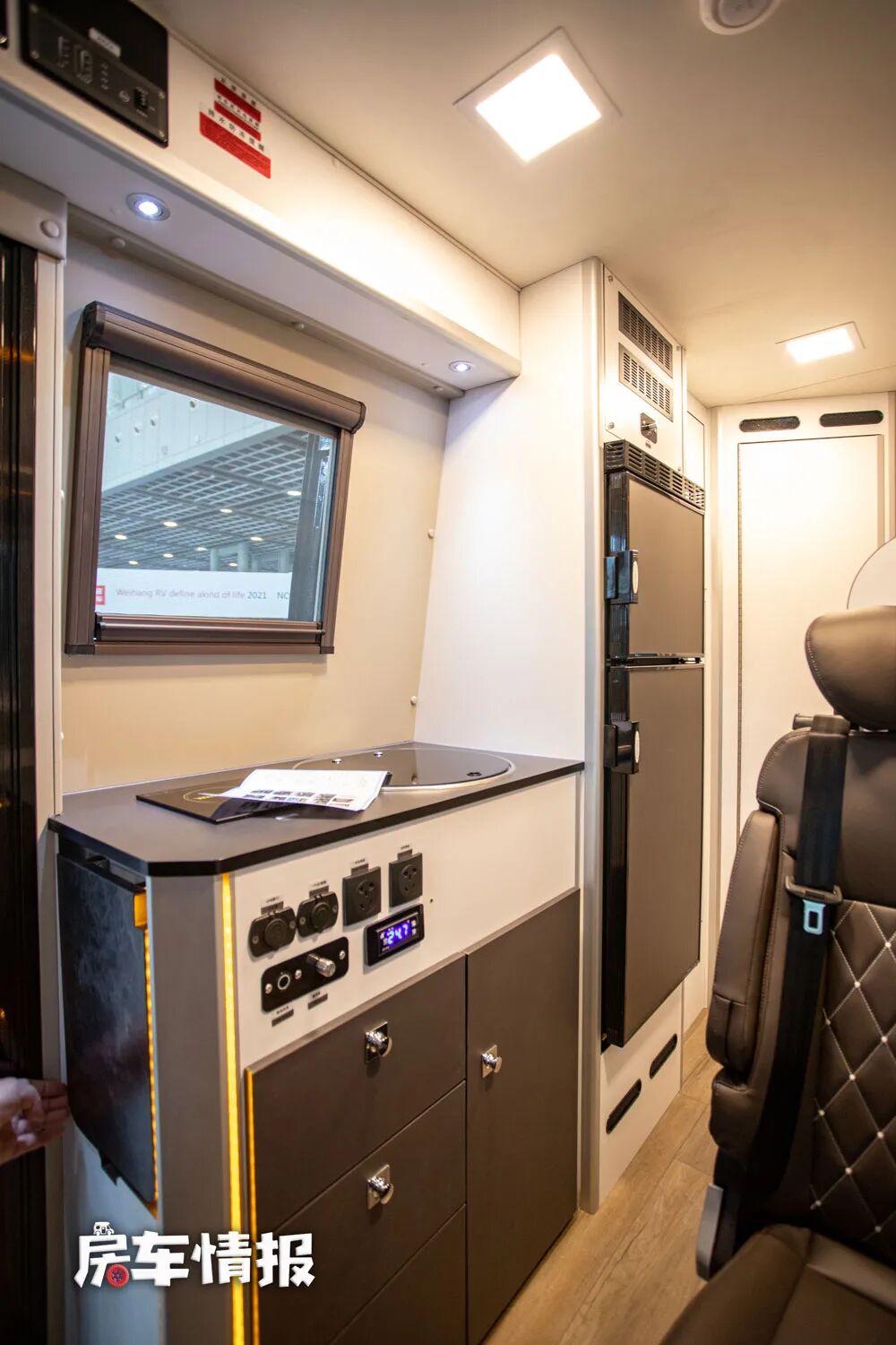 临近乘客门的地方是全车的厨房区,台面上提供了900W的电磁炉和一个带盖的水槽。下方则提供了多个储物空间。