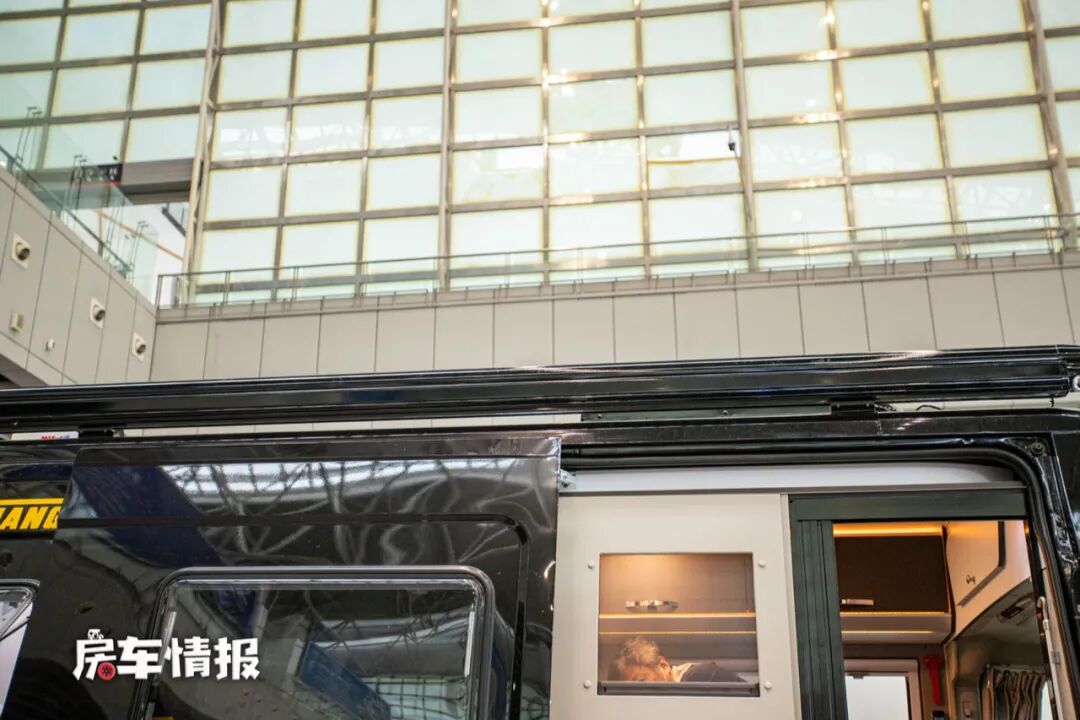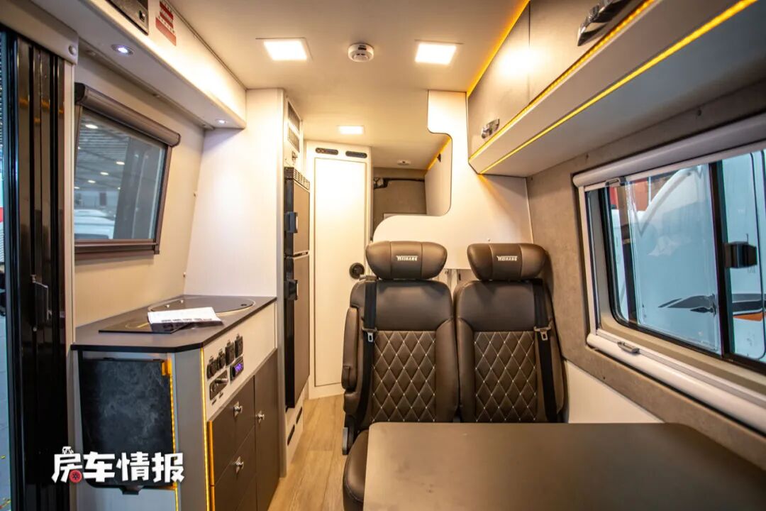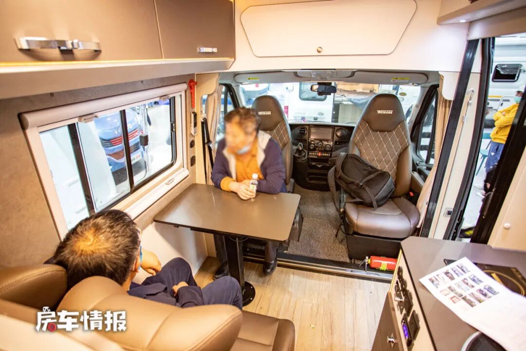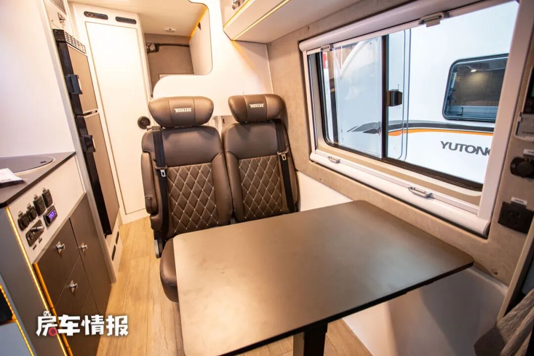 正对乘客门的是全车的会客区域,提供了两个单人沙发座椅,分别配备了头枕和安全带,外侧的座椅还带有乘车扶手,大大缓解了行车过程中的疲劳感。座椅前方的升降餐桌尺寸也很大,平时可以在这里吃饭聚餐。